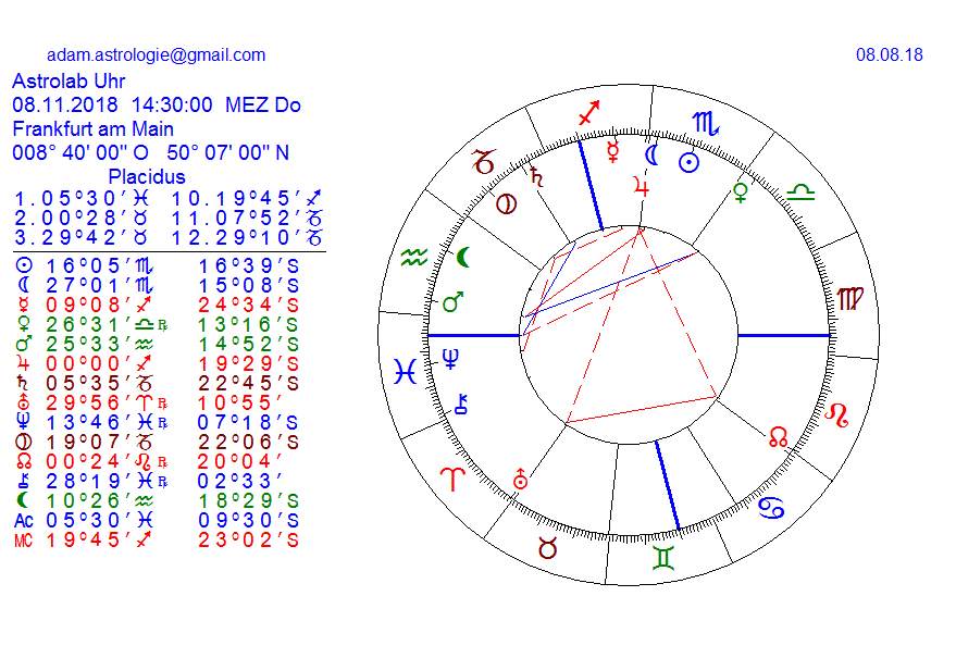 am 8.Nov geht JU in sein eigenes Zeichen Schütze, wenn wir dem radix glauben schenken dürfen, dann entsteht der Eindruck einer friedlichen Welt, oder anders gesagt, die derzeitigen geopolitischen Probleme, stehen kurz vor einer Lösung, JU im eigenen Zeichen treibt diesen Optimismus, aber auch dessen Inflationierung, insofern weil es im Jahre 2019 auch zur Quadr Stellung zu NE kommt, der seinerseits im eigenen Zeichen steht, das mag ja gut sein, auch für ein friedliches Zusammenleben, aber dennoch widersprechen sie sich gegenseitig, ich sag es mal philosophisch, was den Unterschied zwischen Wahrheit und was die Menschheit darüber zu wissen scheint ausmacht.