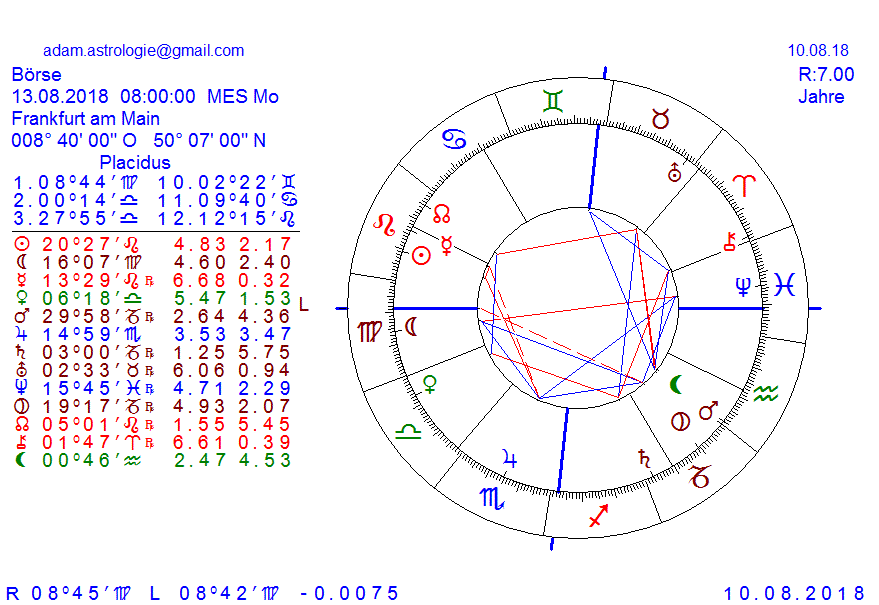 Zitieren wir den letzten Mondlauf , dann war das Tief im Zwilling , ein weiteres Anfang Jungfrau und Anfang Skorpi . In diesem Monat Anfang Jungfrau am Montag und Anfang Skorpi am 16. . Wobei der 17. wegen der Möglichkeit von Fatalismus das Gegenteil bewirken könnte. Letzte Monat mit MonD im Skorpi schwankte der Dax im Tief bei 540 und im Hoch bei 700. danach gab es eine eindeutig gute Woche. !!