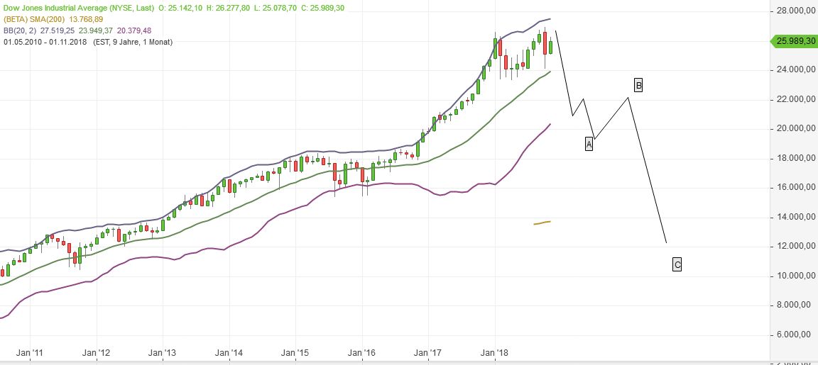 Wenn die 1 klassisch ein Drittel der ganzen Welle ausmacht, ginge die A im Dow bis ca 20000, dann eine Bärenflagge B rauf, dann eine C weiter runter. Das zieht sich aber mehr als ein Jahr hin, siehe Bild