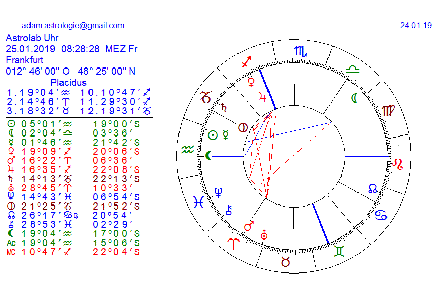 der 4.1. wiederholt sich betr. Zeichen durchwandernden Mondes am 31. . Möglicherweise ist heute schon letzter Kauftag, abgesehen davon,daß man immer kaufen kann, bzw morgen Vormittag. Das Hoch 2018 im Januar war am 24.1 ? . VENUS stand über der SonnE im Wassermann im Wassermann und MK. VENUS steht zur Zeit aber erst im Schützen ,am 2.2. im Trigon zu Uranus, was einen Sprung nach oben bedeuten Müßte. Mars Quadrat Uranus 20 Stunden vorher bedeutet das nun erhöhter Antrieb ? Und Mars Konjunktion Uranus am 13.2. ? Das ist " bombig " ,fragt sich nur in welcher Beziehung. Irgendwo könntenwir das Hoch für 2019 sehen ? Ist natürlich gewagte Spekulation und sinnlos.