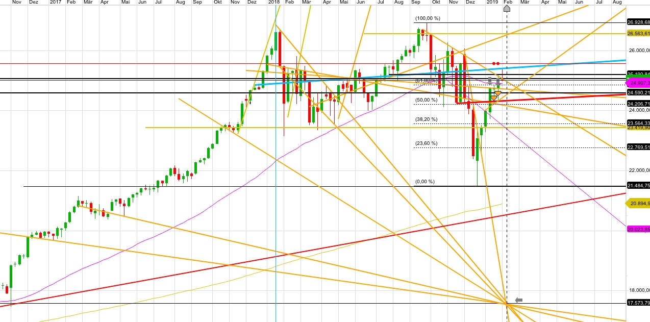 Beim Weekly haben wir einen Kanal. An dem oberen Kanalrand, hat der Kurs wiedermal überschossen, aber auch das hat ein Grund. Den zeige ich anschließend. Ob der Dax Montag mal etwas Luft holt und etwas ansteigt bleibt abzuwarten, aber die Tendenz, wie es hier schon einige geschrieben haben, ist runter.
