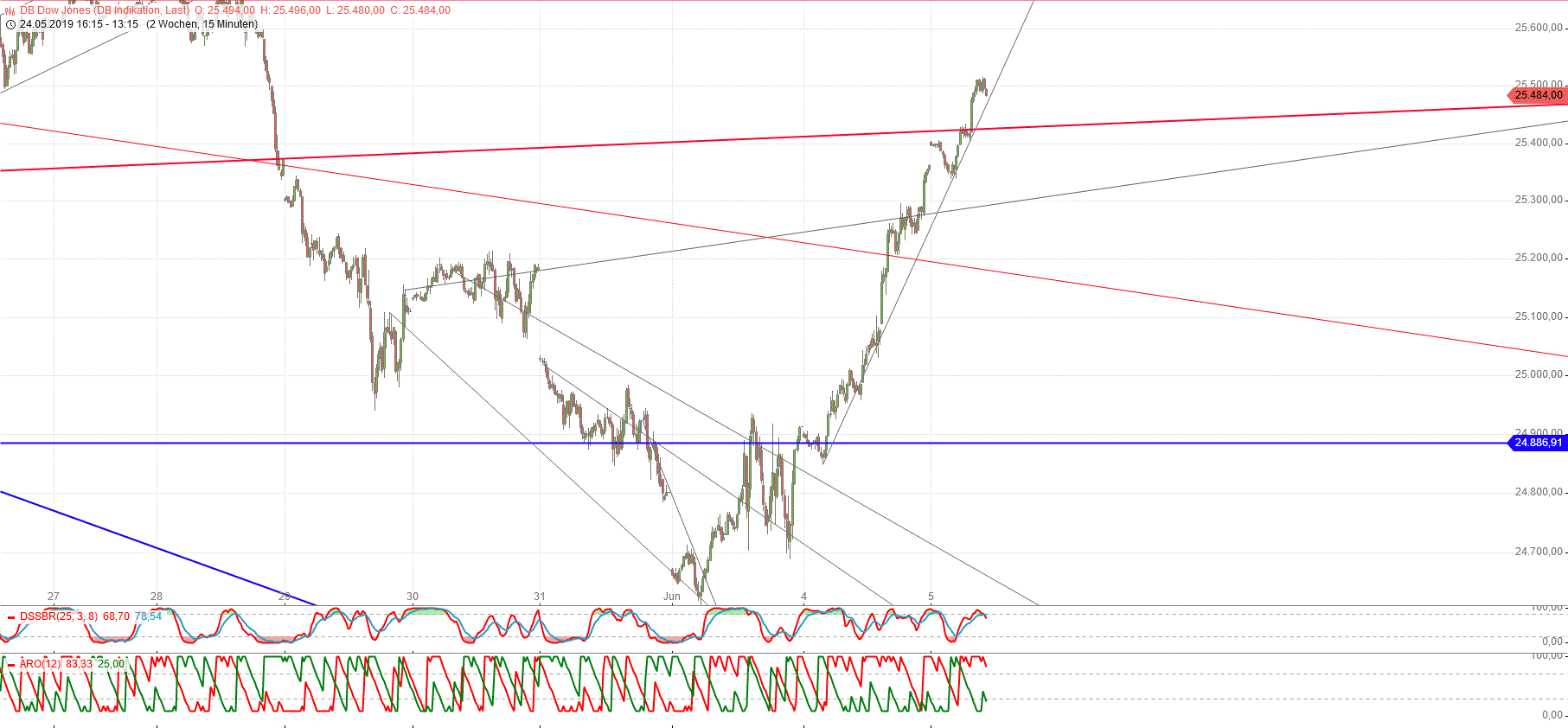 Es sieht nun stark nach short aus. Wichtig ist die Weiche mit der roten Linie. Unter der roten Linie klares short Signal