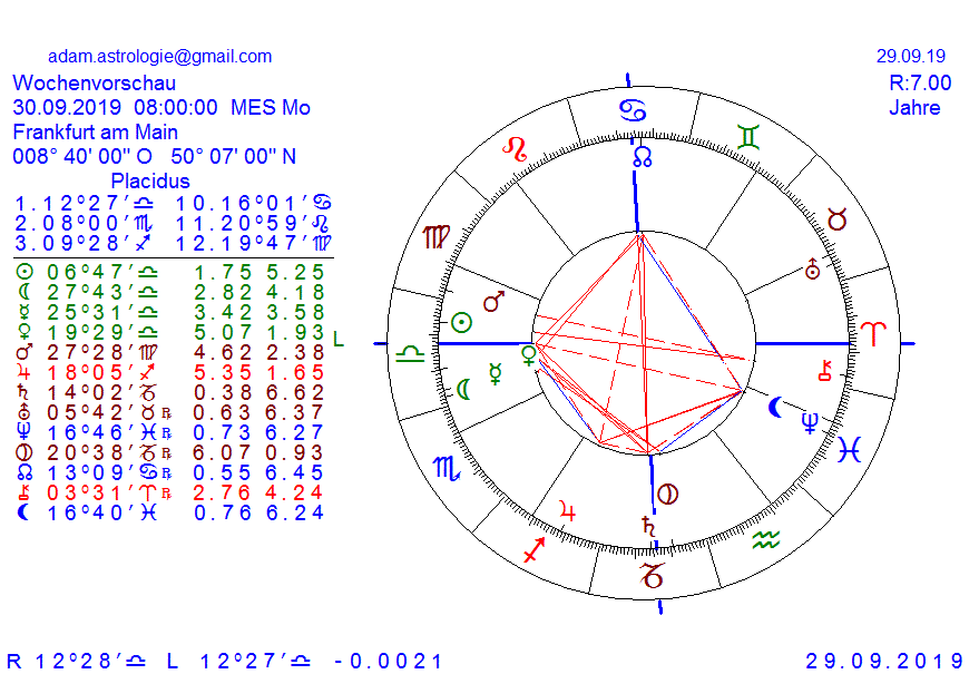 die woche beginnt ja sehr harmonisch, mit MO,ME und VE im 1.Haus Waage, VE noch im sext zu JU, man könnte auf eine gute stimmung schliessen, nur noch getrübt von einem VE Quadr PL aber ich denke das wird zuwenig sein um die stimmung über die woche hinweg zu drüben, es ist eine woche wie die ruhe vor dem sturm, denn das SO Quadr SA rückt näher, die darauffolgende Woche....