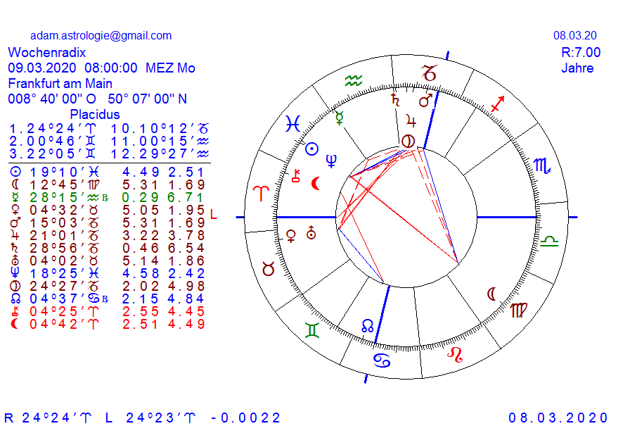 ich werde morgen das wochenradix reinstellen, ich beurteile die lage, für max 10tg mögl steig aktienkurse, diese woche ist gold und die aktien konträr verlaufen, was ja vor 2 wochen nicht der fall war und da ich einen durchbruch bei gold erst wieder am 18/19 sehe, einen punch durch den MO, könnten sich bisdorthin die börsen erholen, da rede ich jetzt nur vom MO, was die anderen Pla betrifft, da haben wir eine geteilte tedenz, keine quadr auf die stbk pla, sext von NE und SO, komm. woche ein SO sext JU, zu beginn der woche und VM, das könnte stabilisieren bzw die richtung kurzfristig ändern, nur wir haben ein problem und das ist MA, der jetzt nacheiander JU,PL und SA passiert und da kann tägl alles sein, wir befinden uns in einem krieg um die macht im system, die expansionsbestrebungen sind eingeschränkt, dann versucht man es eben mit gewalt, ich hoffe das haben viele Menschen bereits erkannt, daher gibt es steigerungsmöglichkeiten, der virus ist wie ein antesten und zeigt uns unsere schwachstellen, politiker sind keine experten, aber wie gesagt, für den niedergang genügt es