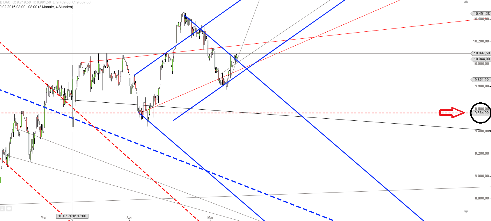 Im Dax 4 Std Chart haben wir ein steigendes Dreieck, was bereits nach oben verlassen wurde. Das ist absolut Regelkonform. Nachdem die obere Schenkellinie nach dem eintauchen ins Dreieck mehrfach getestet wurde, gehe ich davon aus, dass der Dax dort nicht mehr hin muss. Wichtig ist nun, dass die obere Trendlinie (fallende blaue Linie)hält, sonst werden wir wahrscheinlich die 9500 sehen. Im 30er, In der Std und auch im 4Std Chart habe ich genau diese Marke. Der obere Trendrand vom Std Kanal liegt im Moment bei 10020 weiter fallend.