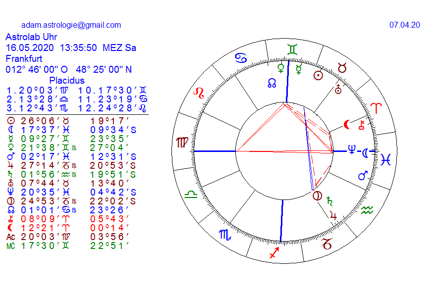 ihr seht das trigon von SO zu JU, PL und dann noch zu SA, eine phase vom 15- 22 mai in der die SO stabilisiert, dass dürfte auch ihre stärkste stellung im ganzen jahr sein, aber wenn man die kleinen Pla betrachtet, ist hier noch ein ordenliches wirrwarr angezeigt, wir nennen die inneren Pla die kommerziellen Einflüsse auf die menschen, das tagesgeschehen, die betroffenheit macht sich hier wirksam, wie unterschiedlich das problem erlebt wird, auch in den einzelnen ländern, wir haben bereits 4 Pla R, was ein aufwühlen der alten problematik verursachen könnte, die wirkungen der depression kommen jetzt bei den leuten an und da es sich hauptsächlich um Zwill und Fis im Quadr handelt, geht es um schnelle anpassungsfähigkeit und Hilfeleistung, es kann dabei ein kommunikationswirrwarr entstehen, streit und ängste, die ventile öffnen sich, besonders gefährdet sind die schnelllebigen gesellschaften, die von heute auf morgen programmiert sind und sich ein immenser finanz schaden anzeigt, was die existenzen betrifft, das kommt in dieser zeit des radix so richtig ins bewusstsein, denn MA im Fis kann handlungsunfähikeit bedeuten, inflation und teuerung und arbeitslosigkeit, auf almosen angewiesen sein, es wir besonders das bewegl. kreuz treffen zwil, fisch als auslöser und Jungfr und schütze sekundär, von oben her sucht man zu stabilisieren, was auch gut für die börse sein kann, unten herrscht mehr oder weniger chaos, die VE ist R, es betrifft hauptsächlich die südländer Italien,Spanien,GR, Türkei, aber auch länder in Südamerika wie Mexiko usw. und die meereswirtschaft, sobald der MA mitte Juni den NE erreicht, verunreinigung des wassers,haben wir einen schnittpunkt oder zensur erreicht, entweder gibt es dann eine impfung mit zwang der persl.reiseeinschränkung, ende der pandemie oder neuausbruch, wobei die menschen immer hektisscher werden, es ist schwer posit.zeiten im jahr 2020 zu finden, denn sobald der MA im JUli in den Kre geht, besteht die gefahr dass die staatsordnung gefährdet ist und da er in diesem zeichen auch noch R wird, sind der gewalt im Sommer und frühherbst keine grenzen gesetzt