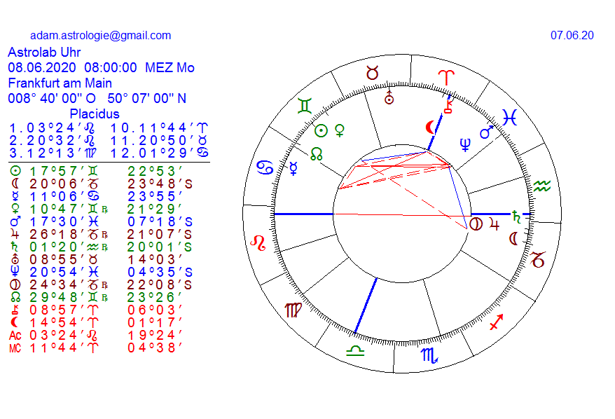 man kann von einem krisenhoroskop reden, der Block im 6 haus der von SA geprägt ist, zeigt uns die einschränkung der wirtschaftl expansionskraft, existenz und arbeitsplatzverlust, sozusagen befinden wir uns momentan im höhepunkt der krise und es gibt auch momentan kaum lösungsmöglichkeiten der krise herr zu werden, wobei die SO als herscher des radix und VE im Quadr zu NE und MA die Illusion anzeigt und auch die Täuschung und Enttäuschung, die wahrheit wird nicht realisiert, Einordnungen sind nicht möglich, das chaos pur steht in den sternen und es wird aus dem hintergrund auch noch gefördert, die spaltung der gesellsschaft um dann hart druchgreifen zu können, denn höhepunkt werden wir im spätsommer erleben, zur zeit läuft betrug und lüge auf höchster ebene, diese gewalttaten und demonstrationen(kommt von demonen) sind geschürt um einen totalitären staat installieren zu können, der ordnung schafft, aber nicht gerechtigkeit und solidarität mit den bürgern