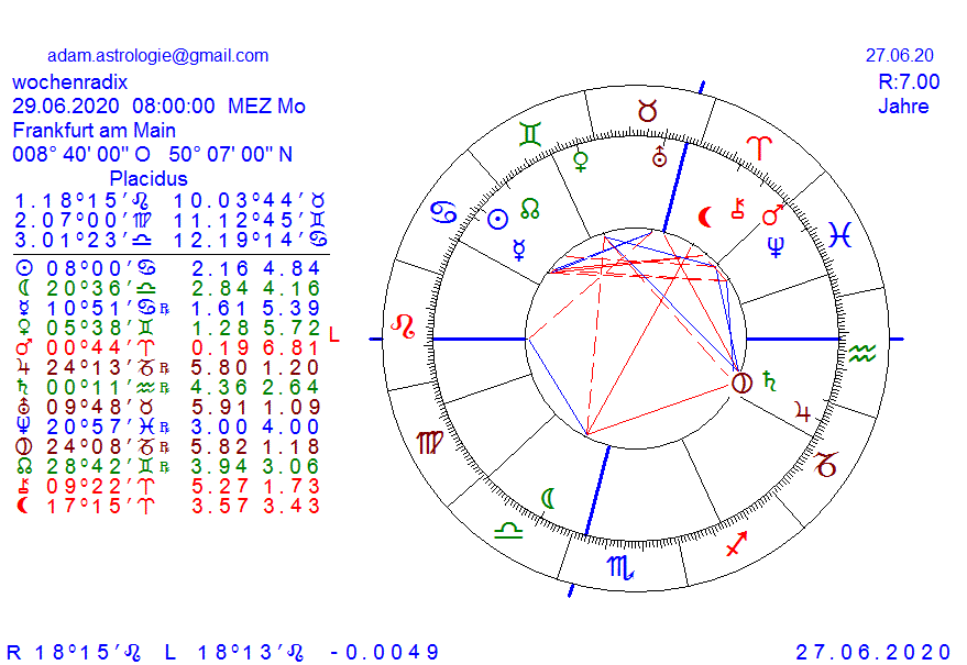 das problem sitzt im 6 Haus und betrifft daher die arbeitslosigkeit und die existenzenbedrohung und zwar nicht nur auf der unteren ebene der pyramide, die masse der mensschen, sondern die spitze selbst, da die pyramide gefahr läft zu zerbröckeln, dieses radix steht in bezug zur deutschen börse als momentaufnahme der gesamtsituation und es scheint, dass das pulver verschossen ist, aber solange JU im Sext zu NE steht, wird man es zu kaschieren wissen und versuchen den Flächenbrand zu löschen, wir sind in einer situation in der die Jungfrau(3Pla in 6) die füsse zusammen zwickt, um einer vergewaltigung zu entgehen, aber mit MA im Widd wird das zuwenig sein, da werden einige glauben sich mehr rechte raus nehmen zu können, aber der block in 6 ist kaum zu bewegen, der knoten ist so stark verwoben, sodass nur die Einsicht der Proponenten von macht und finanz in 6., historische lösungen anbieten kann, dazu ist es 2020 noch zu früh, es wird sich viel auf der strasse abspielen, hin bis zur sinnlosen zerstörung von hab und gut, meist anderer, man neigt zu einem rundumschlag, doch die wahre systemveränderung kommt erst mit 2021 im wassermann..
