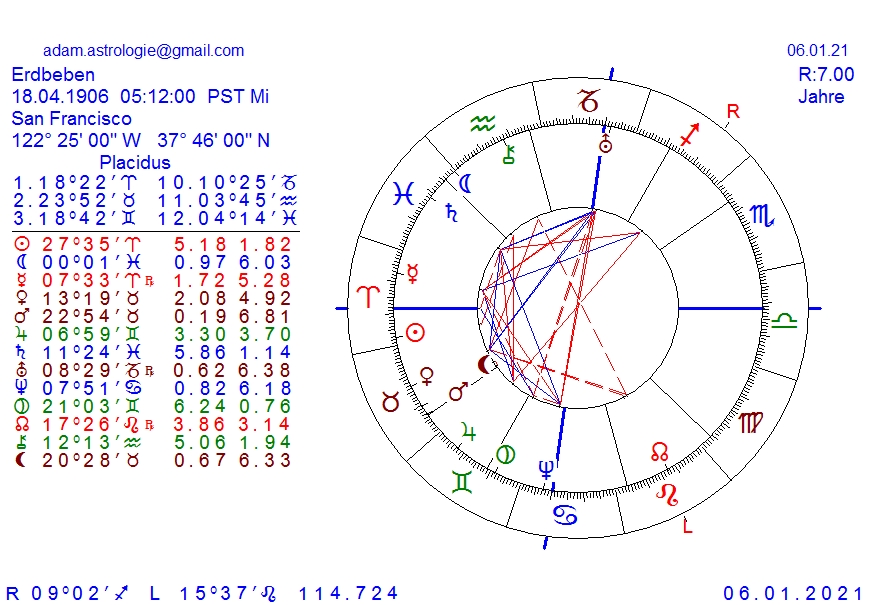 ausloser für das erdbeben in francisco war der MO mit seinen eintritt in die 0°Fische, damit hat er den NE in seinen eigenen zeichen Krebs ausgelöst, da sprechen wir von einer rezeption, wirkt wie ein doppelstarker zünder, dazu MO und SA 12.Haus ist wiederum Fische und NE qualität, MA und UR in Erdzeichen wie heute, aber für mich ist widder ASZ gleich PLUTO in 3, damals noch nicht, da war es MA in 2, weil ja auch die 1/2 stadt brannte, die einmaligkeit des radix liegt im momentum der MO auslösung und der einseitigen planeten belastung zur zeit des bebens über der stadt