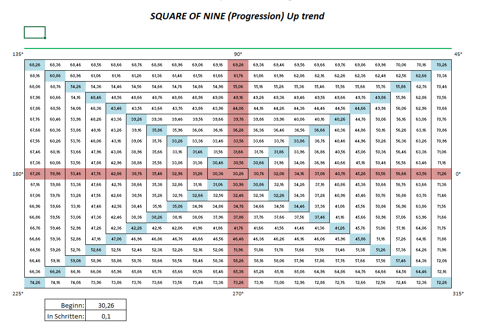 Als Aktie im letzten Jahr bei 10,10€ stand müsste man im Square of Nine mit dreistelligen Zahlen rechnen und so ergaben sich folgende bevorzugte Winkeln: 45° (im diagonal cross) und 180° (im cardinal cross)