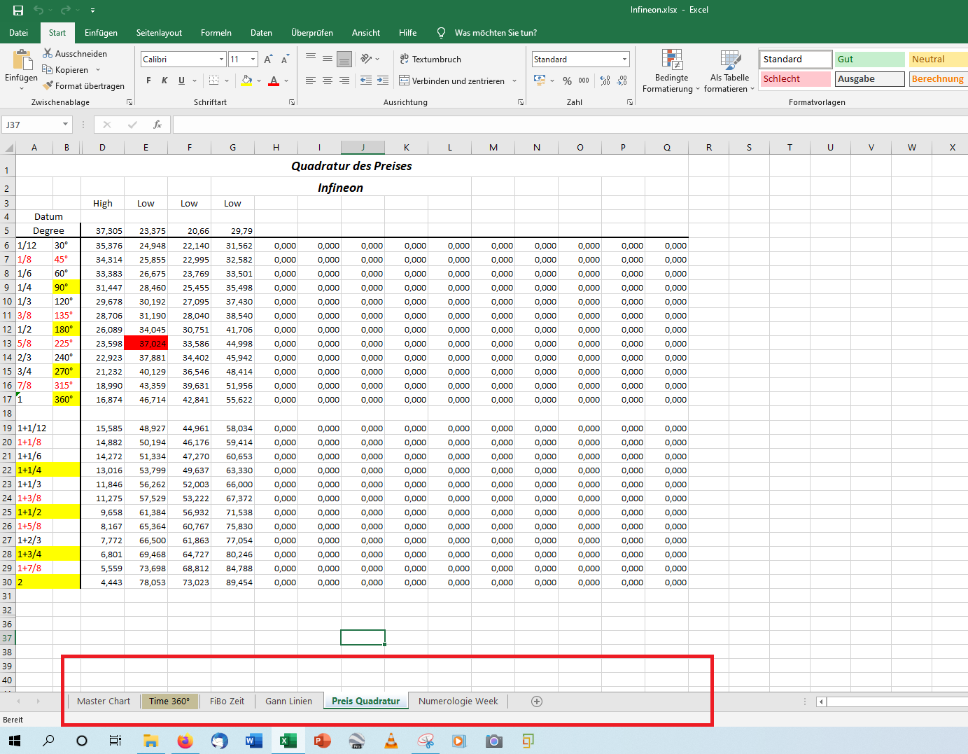 Hochs in Februar und April dieses Jahres entstanden an 36,96 und 37,305. Dreistellig = 371 in 180° und zweistellig 37 = 45°