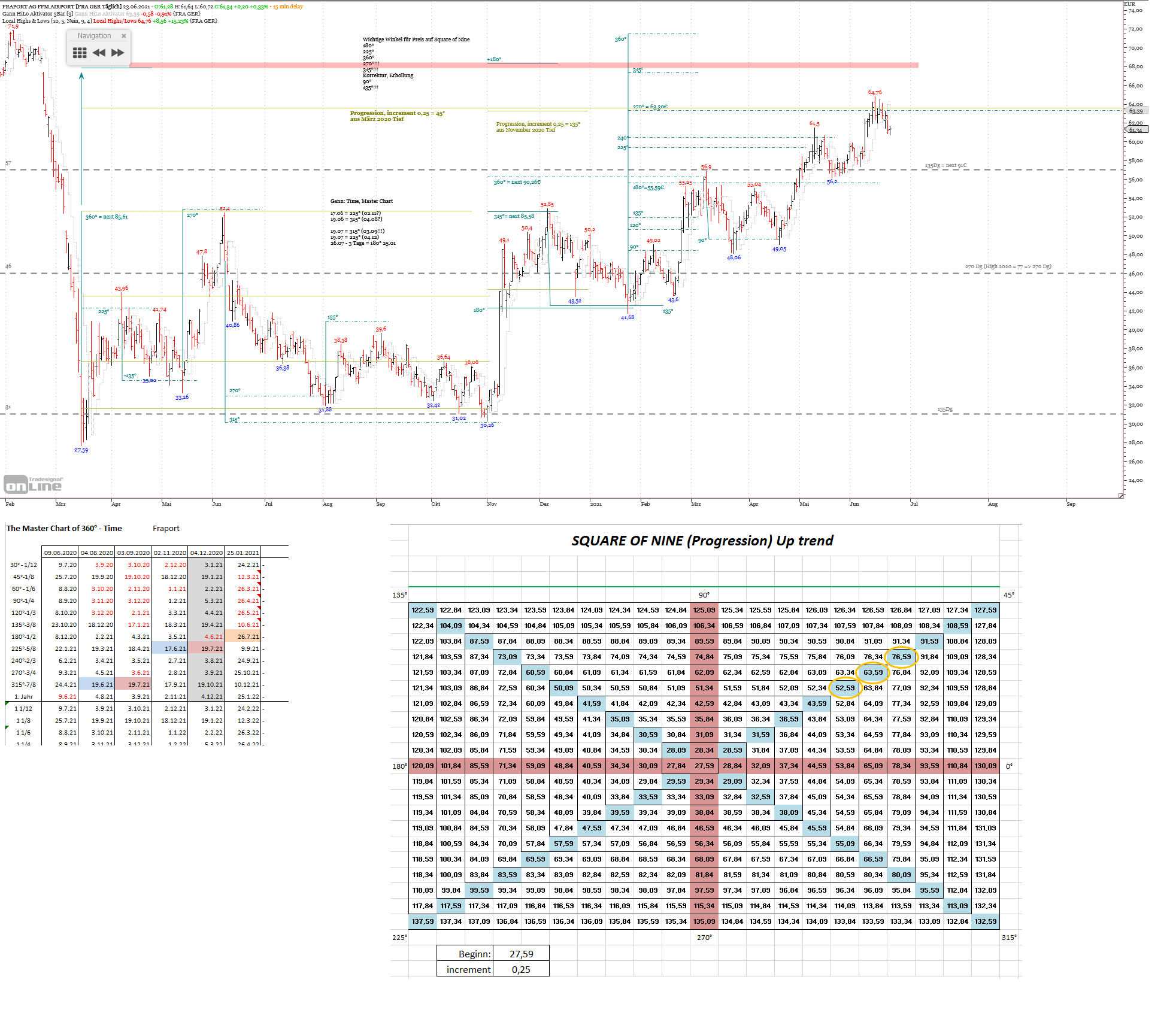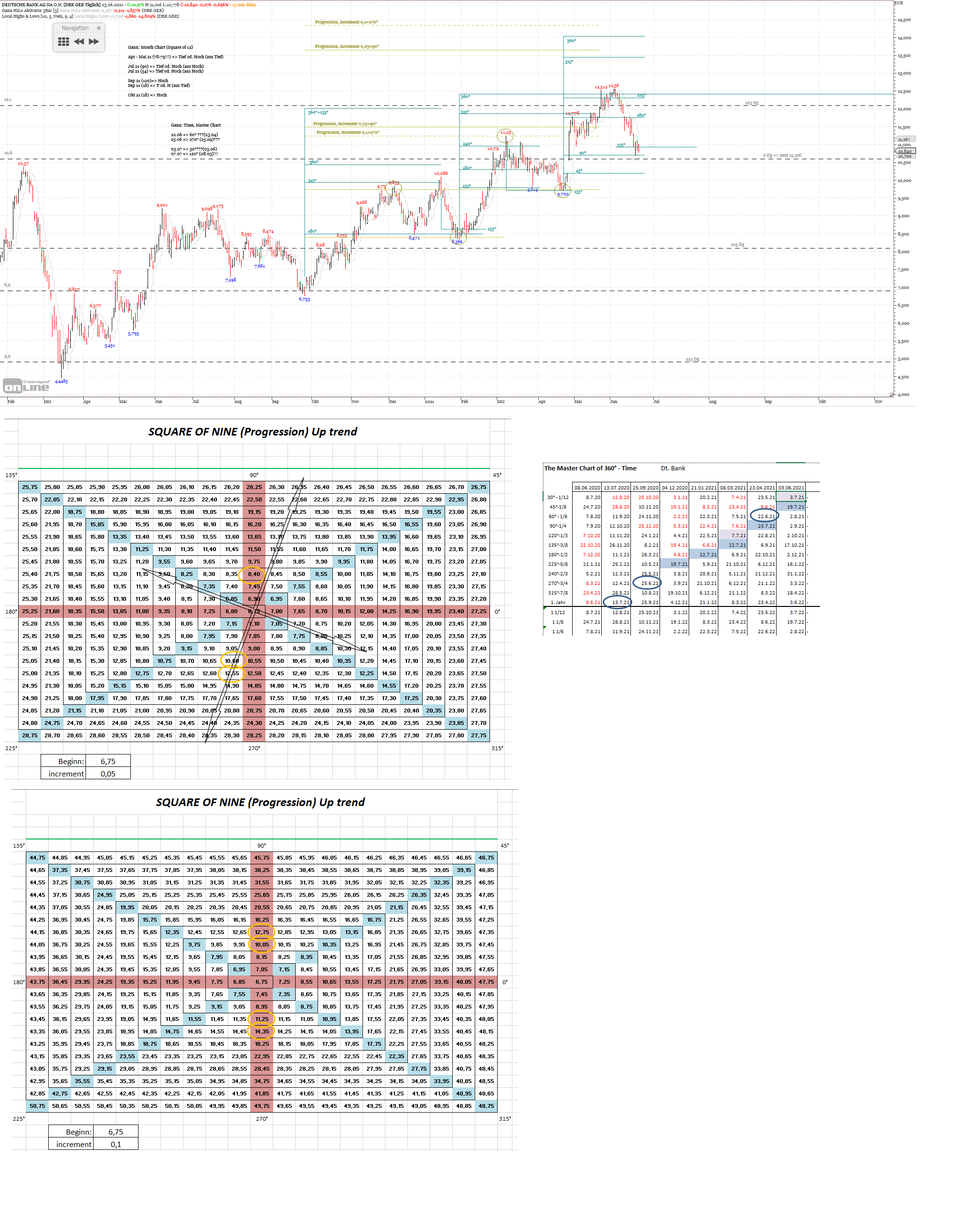 Für Progression gilt noch Inkrement von 0,05, allerding müsste dieser oberhalb von 12,50 angepasst werden (meine Vermutung). Habe schon mal zweiten Square of Nine fertig gemacht und wie man sieht, das Hoch im März bei 11,25€ schon mal darauf reagierte.