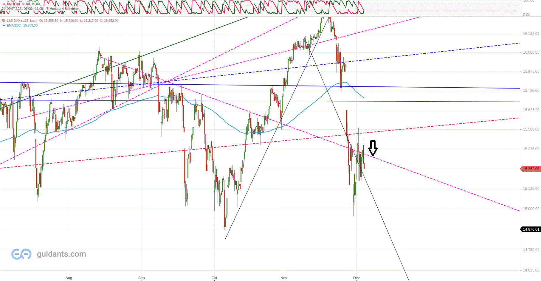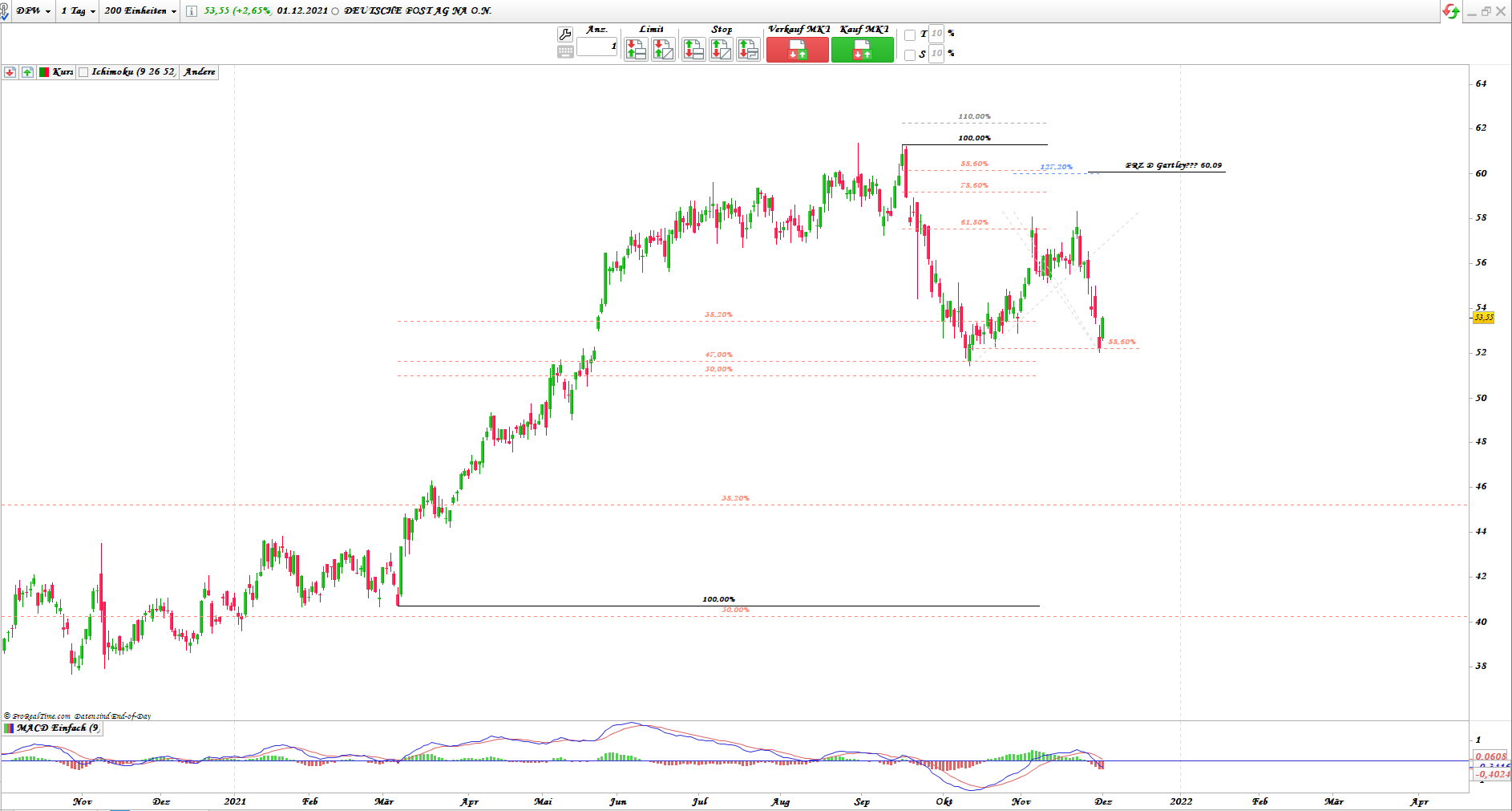 Übergeordnet befand sich Kurs im Ross-Umschlag und brach im November aus, erreichte die 1,618 Fibo (Tief Mai - Hoch März) + "negative Divergenz" mit MACD.
