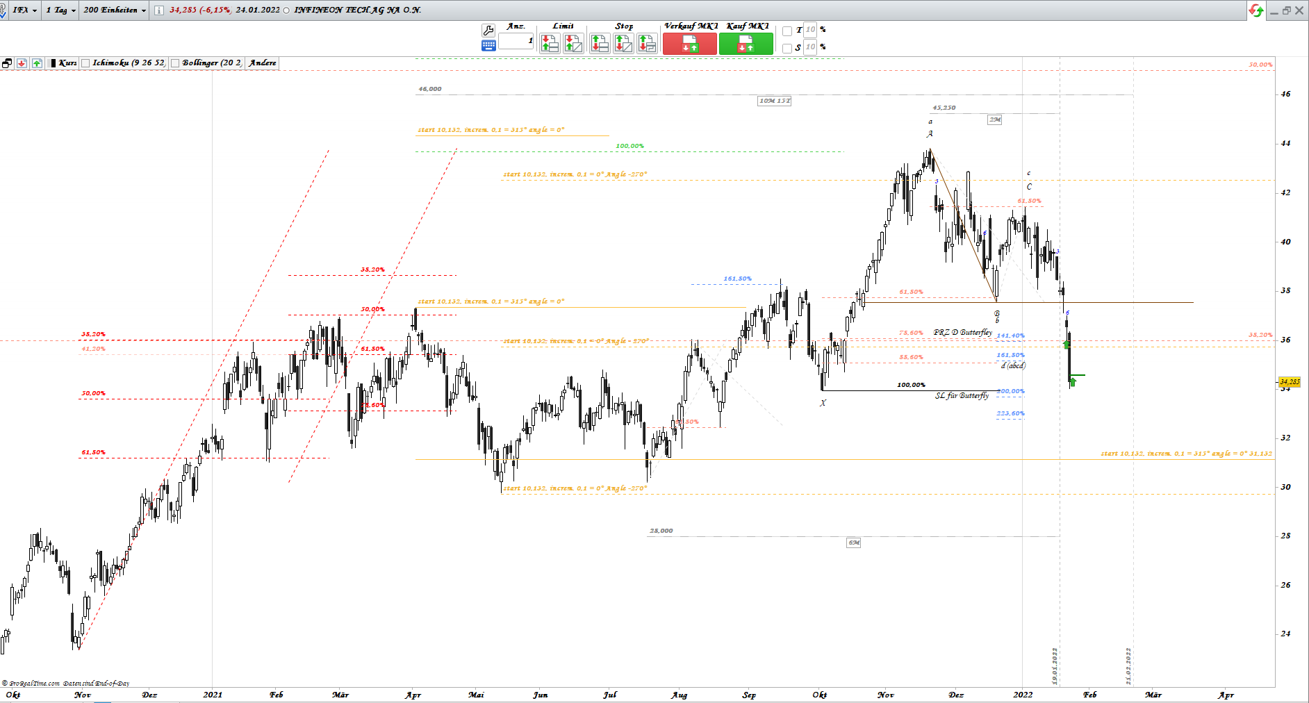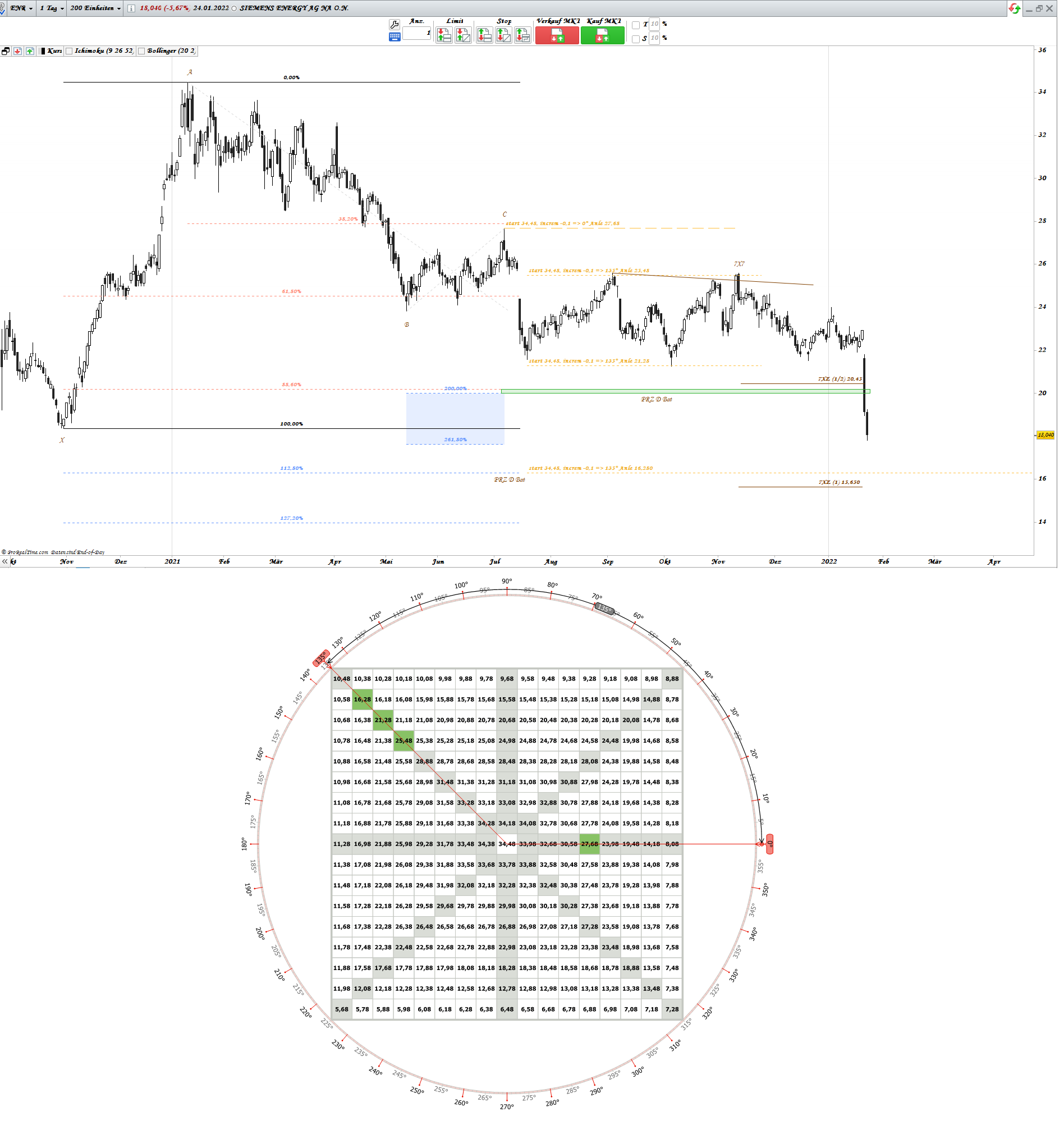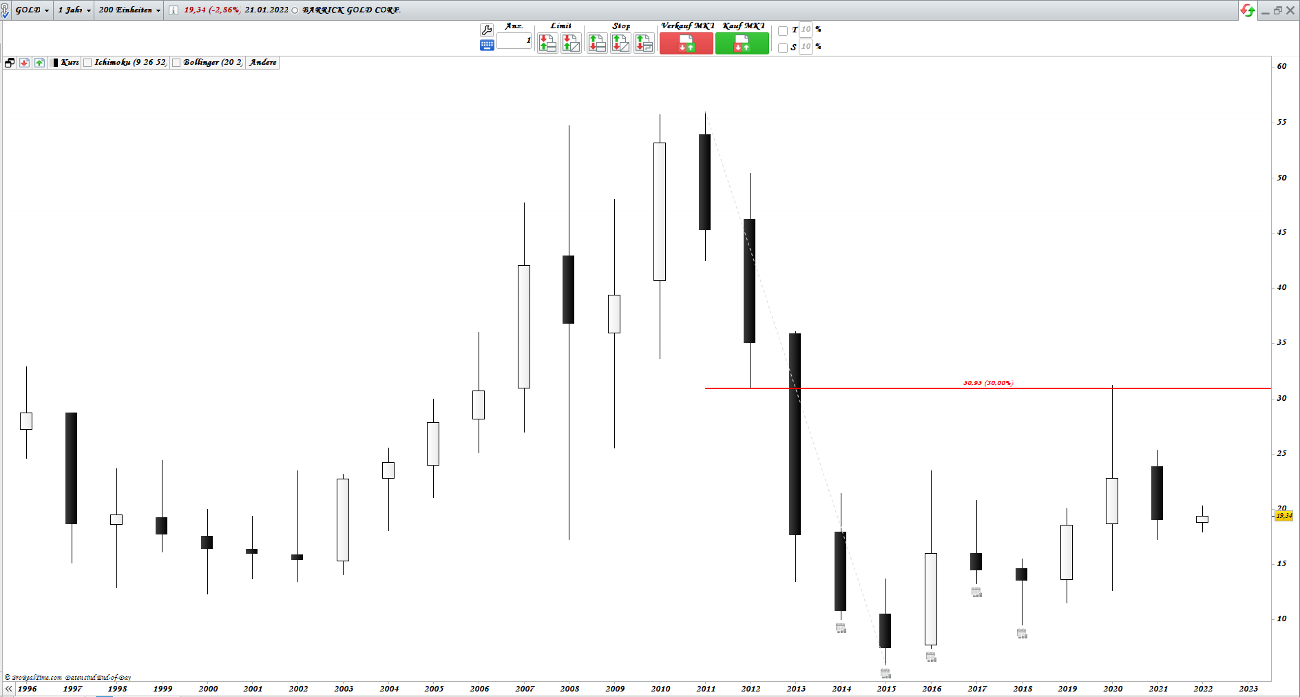 2011 wurde ATH an 55,95 gemacht und 2015 ATL bei 5,91. Somit ist die Hälfte bei 30,93. Gann nannte es (Halfway Point) oder auf deutsch hat man im Internet als Gravitätszentrum umbenannt.