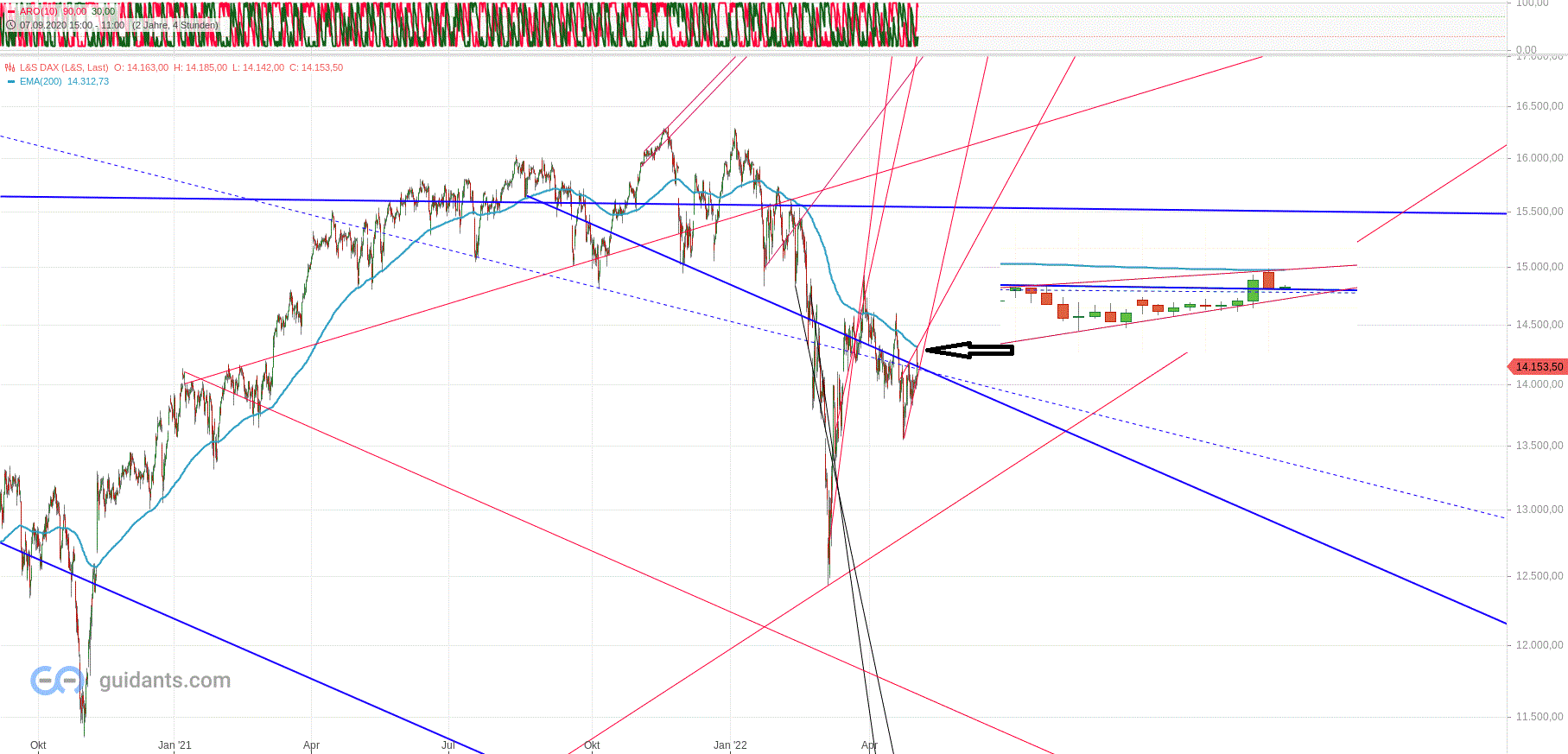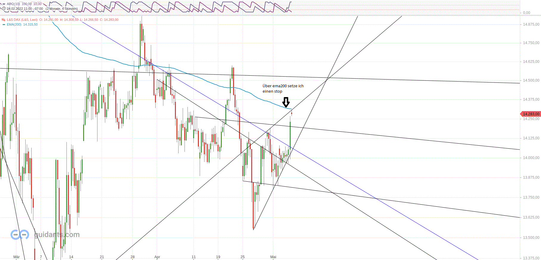 Kann von mir aus nur kleine Windhauche beitragen. Interesssant war trotzdem Anfang der Woche mit Mond Mars Quadrat der Wahnanstieg von 500 Punkten im DOW, wie als Bewegung prognostiziert. Ansonsten ,na ja. Wichtig : am 11.5. wird Jupiter rückläufig . Meist können sich die Kurse in dieser Zeit nicht nach oben entfalten . Mars wechselt am 20.5. in den Widder,was sehr stark für neue Unternehmungen ist. Gleichzeitig beginnt seine Wirkung der Konjunktion der Konjunktion mit Jupiter,welche am 29.5. genau ist. Feuer und Segen passen nicht so recht zusammen. Ab 27.5. wirkt Merkur R im Quadrat zu Saturn , genau am 3.6. , wo er wieder vorläufig wird. Dieses Quadrat wirkt mit aller Voraussicht mit schlechten Kursen. Alle gekauften Puts ,bis zum 13.5. ? , sollte bis Pfingsten ausgelegt sein . Nicht richtig einschätzen kann ich Mars Jupiter, was auch bei der Börse auch evtl mit hoch verbunden sein könnte. Und Mars über Neptun wirkt auch schon ab 11.5. . : Feuer wird im Wasser erstickt . Aus all den Gründen bin ich nicht optimistisch,aber auch nicht zu pessimistisch.