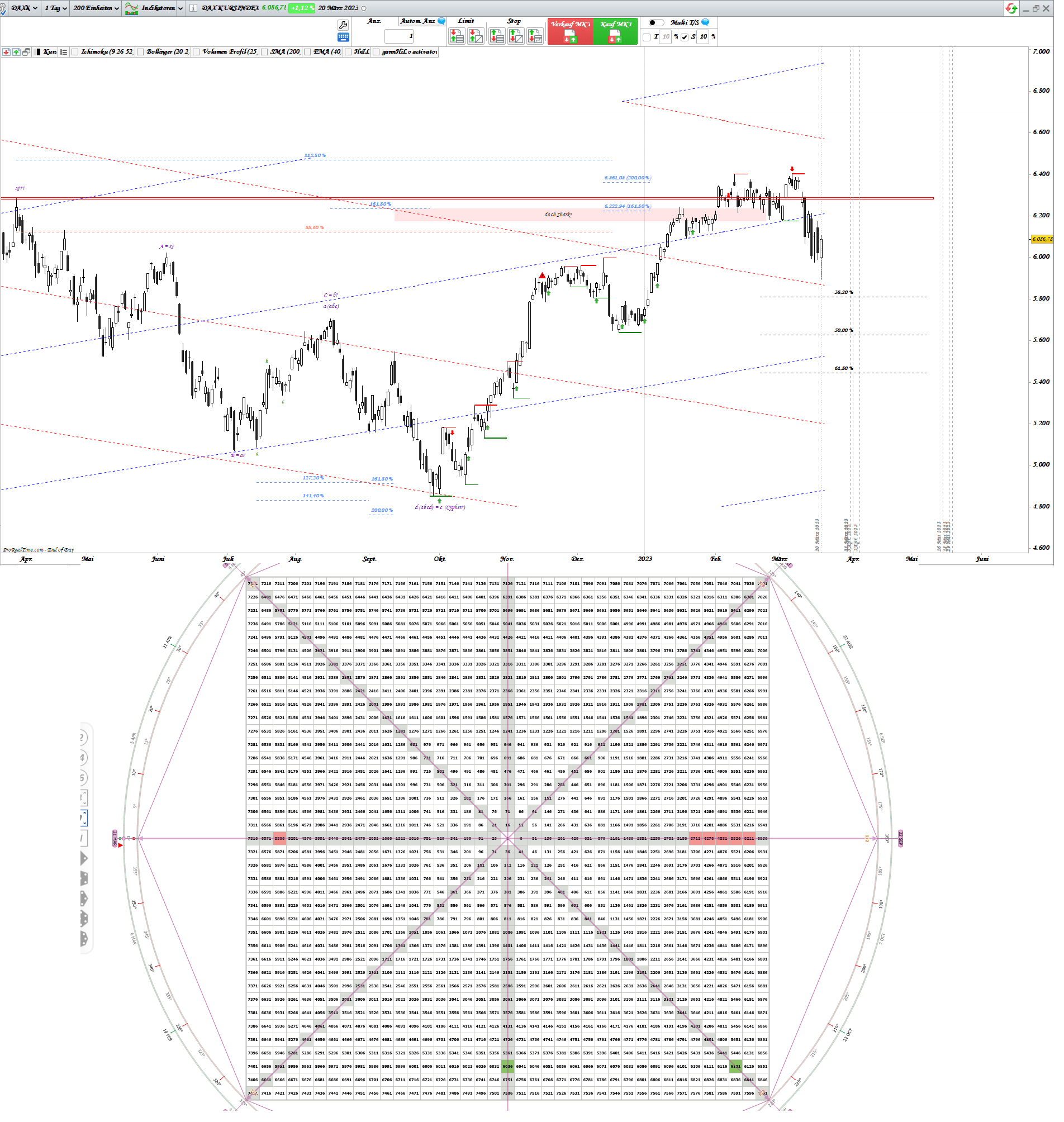 mit diesen Signaltagen interpretiere ich die Lehre von W.D Gann über die Zyklen aus dem Square of Nine, bzw The Master Chart of 360°. Er hat die Winkeln im Master Chart definiert, hat aber nicht expliziert gesagt wo diese Zyklen beginnen. Hat aber folgendes erwähnt: "eine Bewegung, gibt die nächste vor".