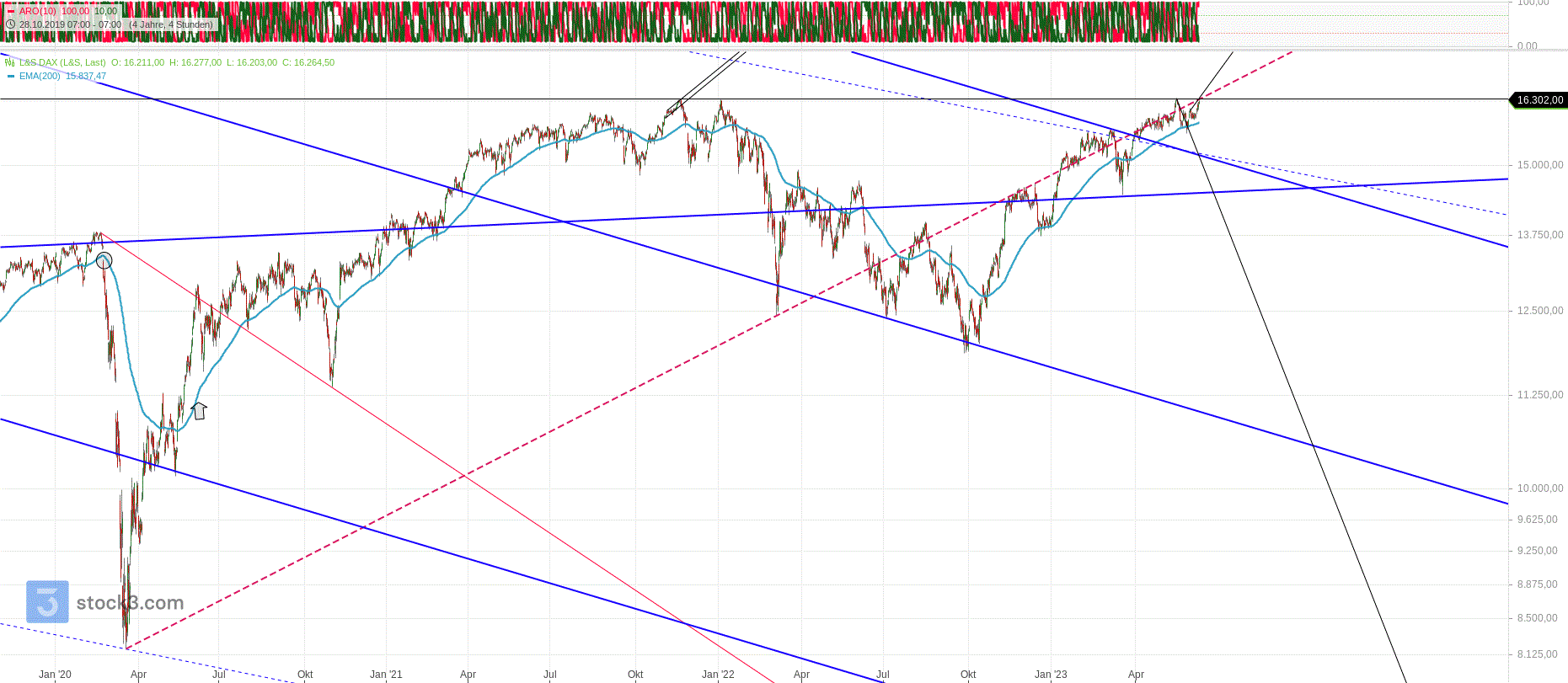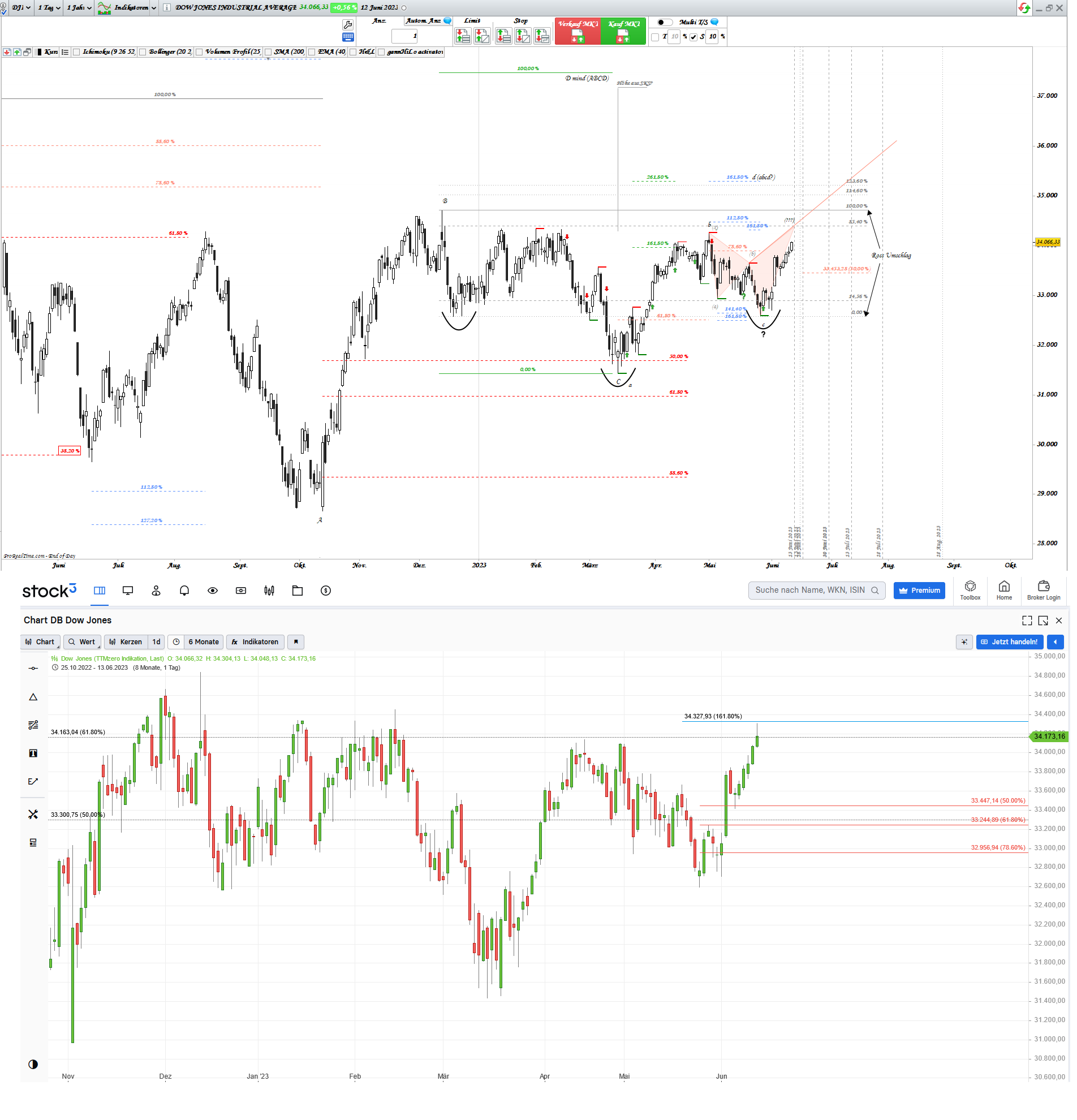 Nach FiBo besteht eine Trendbewegung aus mind. 2 Wellen. Somit betrachte ich den Aufstieg von Oktober letzten Jahres bis Dezember als AB Bewegung. Die darauffolgende Korrektur, bis März 2023 als BC-Korrektur. C setzte auf 0,5 Retracement der AB Bewegung. Würde man die Projektion für Kurszielbestimmung aus der ABC Bewegung nehmen, dann ergäbe sich ein mind. Kursziel bei ca. 37.480 Punkten.