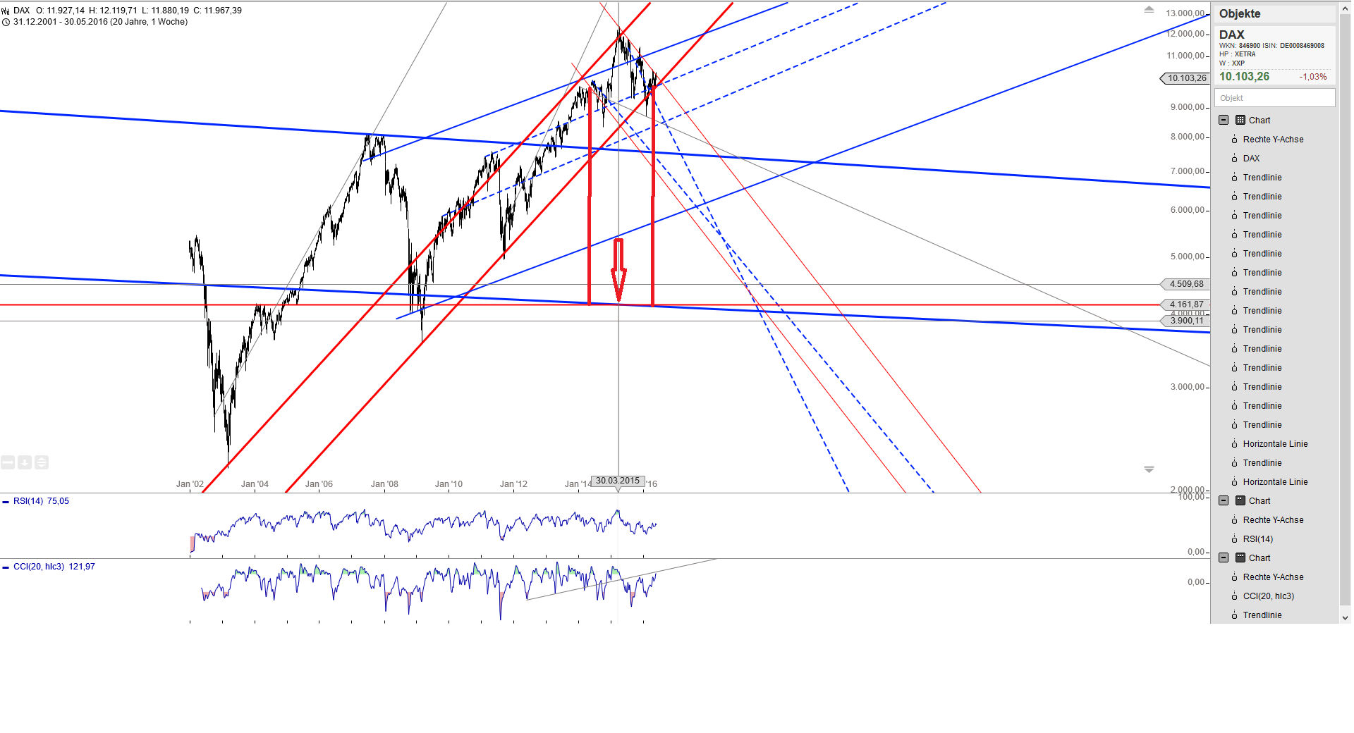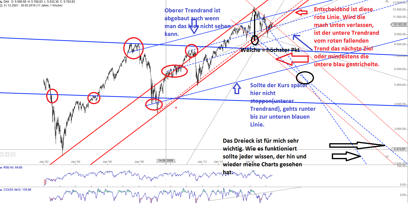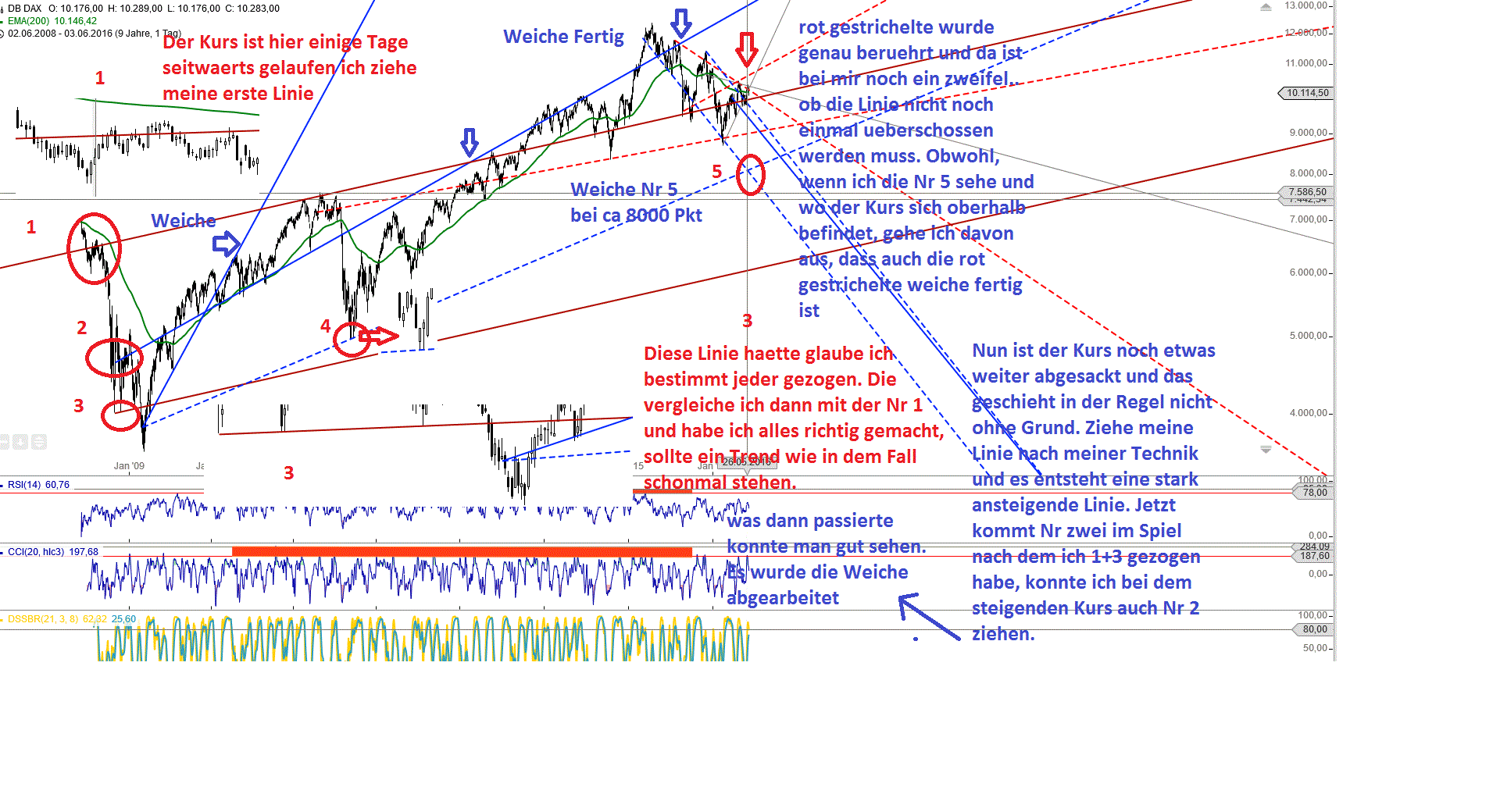 Robbi, Alles, aber auch wirklich alles, deutet auf eine RT(Tasse) hin. Der Henkel zB ist die Spitze unterhalb von dem blauen Pfeil mit dem Text "oberer Trendrand ist abgebaut" Oder die Spitze oberhalb der Weiche. Dann die zwei Bögen. Sollte sich das bewahrheiten, werden wir in drei Etappen den unteren Rand vom fallenden Trend schnell ansteuern. Erst dann gehts wieder etwas rauf und runter, bis wir einen Doppelboden im Kurs erkennen können. Das wäre dann der Boden von der Tasse.