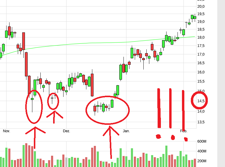 Die Unterstützung wurde zwei Mal getestet, dann erfolgte ein Bruch mittels Gap, bei dem die Aktie anschließend über mehrere Tage im Handelsverlauf unter diese Marke (14,50) gelaufen ist.
