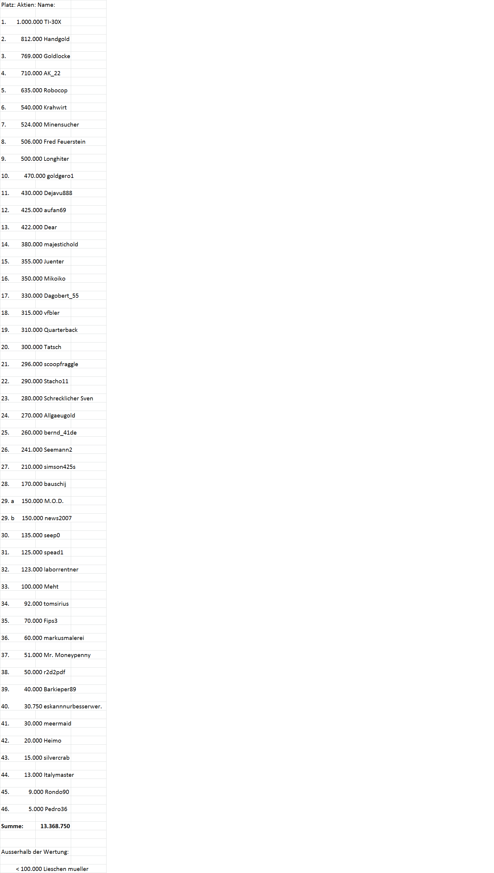 Gedulden wir uns und machen Gedankenspiele. Z.B. zum fälligen Gold-Production-Update für das 4. Quartal, zum Jahresabschluß 2011/2012, über den neuen Minenplan, das anvisierte Audit und natürlich über die vielen Aktien, die zu Niedrigkurs angeboten werden.