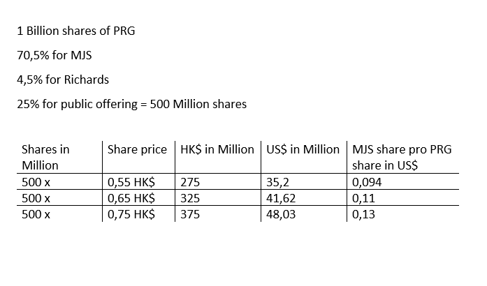 Persistence plant, insgesamt 500.000.000 Aktien anzubieten (vorbehaltlich der Mehrzuteilungsoption), davon 450.000.000 internationale Angebotsaktien (vorbehaltlich einer Neuzuteilung und der Mehrzuteilungsoption) und 50.000.000 Hongkonger Angebotsaktien (vorbehaltlich einer Neuzuteilung). Der indikative Angebotspreis pro Angebotsaktie liegt zwischen 0,55 HK$ und 0,75 HK$ (vorbehaltlich einer Anpassung des Angebotspreises nach unten um bis zu 10 % unter das untere Ende der indikativen Angebotspreisspanne). Nach Abzug der Zeichnungsgebühren und anderer geschätzter Kosten im Zusammenhang mit dem globalen Angebot und unter der Annahme, dass die Mehrzuteilungsoption nicht ausgeübt wird und der Angebotspreis auf 0,65 HK$ pro Aktie festgelegt wird (was dem Mittelwert der indikativen Angebotspreisspanne entspricht) Der Gesamtnettoerlös aus dem globalen Angebot wird auf etwa 265 Millionen HK$ geschätzt.