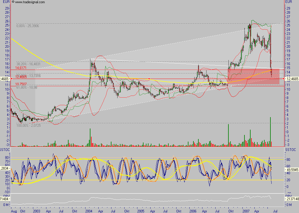 GPC Biotech (Nachrichten/Aktienkurs) verloren nach einem Kurseinbruch vom Freitag von knapp 35 Prozent nun weitere 9,40 Prozent auf 13,69 Euro. Vor einer Anhörung zur angestrebten beschleunigten US-Zulassung des Hoffnungsträgers Satraplatin, die für den 24. Juli angesetzt ist, hatte der Markt vor dem Wochenende mit Panik auf im Internet veröffentlichte Dokumente reagiert. Sie würden Zweifel an Satraplatin rechtfertigen, hatte es geheißen. Das Biotech-Unternehmen hält unterdessen an dem Ziel eines beschleunigten US-Zulassungsverfahrens im Sommer fest.
