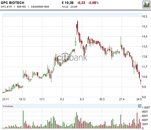 Wie gewonnen, so zerronnen: Noch am 28. Februar stand die Aktie von Aktie von GPC Biotech bei 15,75 Euro – das höchste Level seit zwei Jahren. Nach einem Kursverfall, der durch die jüngste Ausverkaufswelle an den Märkten beschleunigt wurde, notiert sie jetzt um 33 Prozent zusammengestutzt auf Jahrestief.