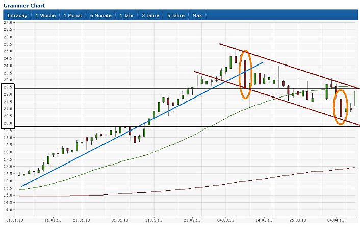 Kommt Grammer aus dem abwärts gerichteten Trendkanal raus oder nicht? Kommt es wieder zu schnellen Abwärtsbewegungen, dann wäre das eine Bestätigung des Abwärtstrends. Jetzt kommt noch der Mai (sell in may...) und das Sommerloch. Grammer brauch einen Ausbruch...