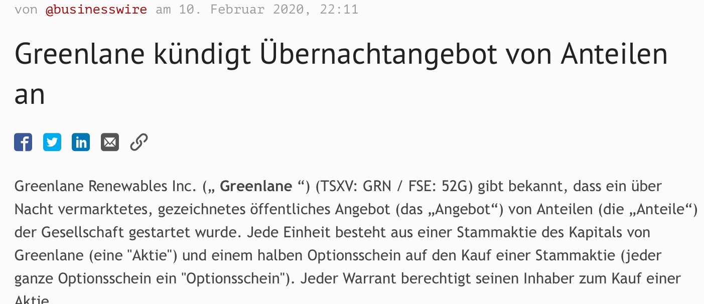 Greenlane Renewables Inc. (TSXV: GRN) (“Greenlane” or the “Company”) announces the size and pricing of its previously announced underwritten public offering (the “Offering”) of 20,000,000 units (the “Units”) of the Company at a price of $0.50 per Unit, for gross aggregate proceeds to the Company of $10,000,000, before deducting the underwriting commission and estimated Offering expenses payable by the Company. In addition, Greenlane has also granted the underwriters of the Offering an option to purchase up to an additional 3,000,000 Units on the same terms and conditions for a period of up to 30 days from the closing of the Offering.