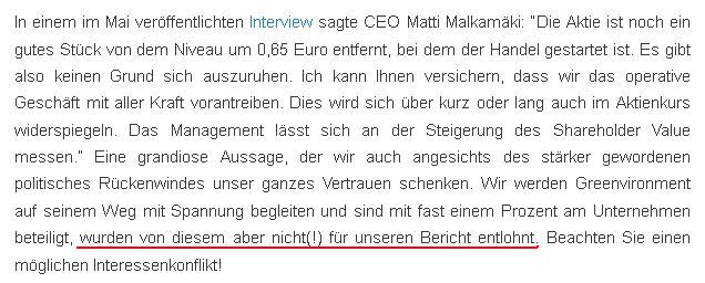 Es spricht sehr viel dafür, dass man die Zahlungsschwierigkeiten seitens Greenvironment bzw. dem Management bewusst verschwiegen und verschleppt hat. Viel mehr noch, man hat es nicht nur verschwiegen sondern nach aussen und dem Aktionär gegenüber anders dargestellt.