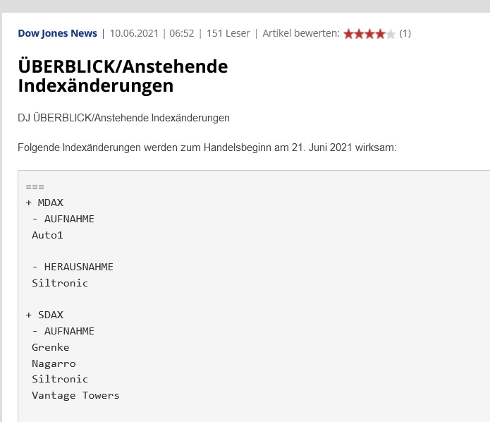 Für Short-Seller macht es maximal noch Sinn hier aktiv zu sein, solange die Index-Aufnahme noch nciht wirksam ist. Also nur noch wenige Tage. Und die kaufe ich bereits regelmässig zu. Da ich mittlerweile meine gewünschte Position habe, sehe ich das gelassen. Ich habe erst eine kleine Position eingekauft als es hieß, dass die wesentlichen Prüfungen abgeschlossen sind. Erst sein Erteilung des Testats habe ich massiv aufgestockt. Alleine die Meldung über den Rauswurf aus dem SDAX hat sofortige 5% gekostet bzw. wurde entsprechend koordiniert. Was man sich ausrechnen konnte und durchaus im Vorfeld schon klar hätte sein "können". Nun ... Wideraufnahme in den SDAX ist geregelt und mittelfristig ist darüber hinaus selbst der M-DAX wieder realistisch, wenn der Kurs sich wieder normalisiert. Und warum sollte das nach Abklingen der Pandemie nicht tun. Das Geschäftsmodell von Grenke funktioniert erwiesenermaßen. Auch wenn Grenke aus gutem Grund vorsichtigt in die Zukunft schaut, das Wiederanziehen der Konjunktur wird überproportial bei Grenke durchschlagen insb. weil Digitalisierung, Förderung, Investitionsstau, Cashschonung etc durchschlagende Argumente sind.