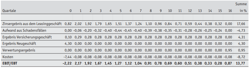 Wenn Grenke heute einen Leasingvertrag abschließt, dann haben sie heute viel upfront Kosten und sie verdienen anschließend im Durchschnitt die nächsten 4 Jahre daran. D. h. das Neugeschäft produziert heute Kosten und ist für den Gewinn die nächsten 4 Jahre verantwortlich.