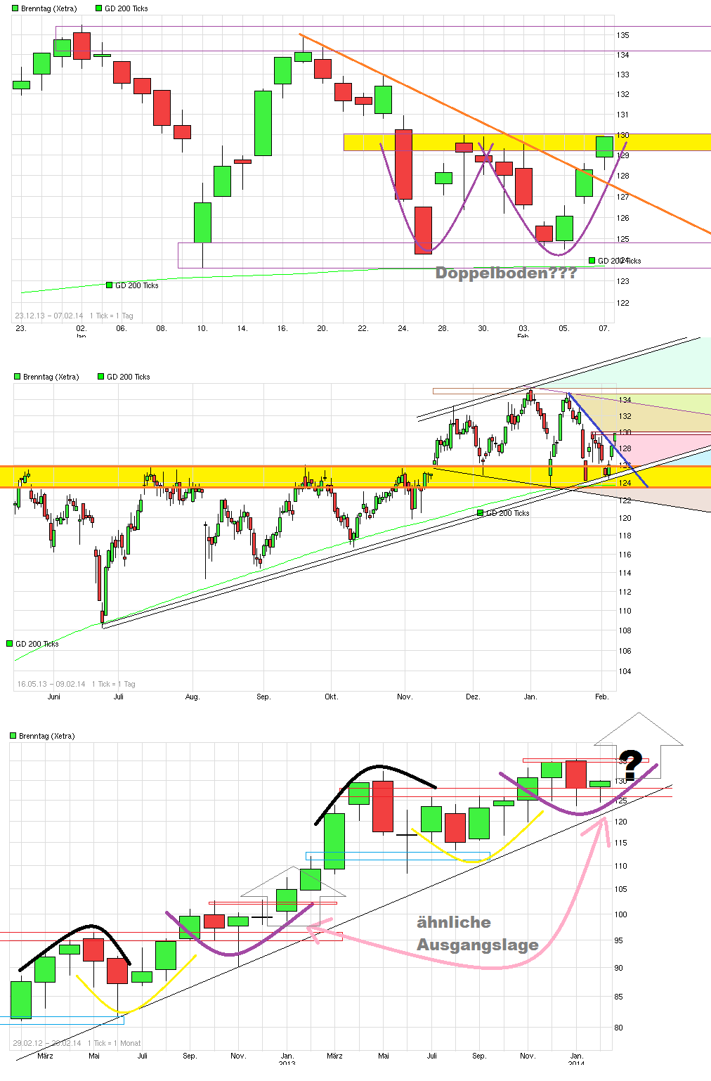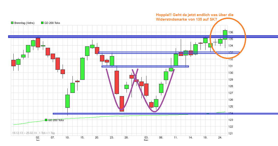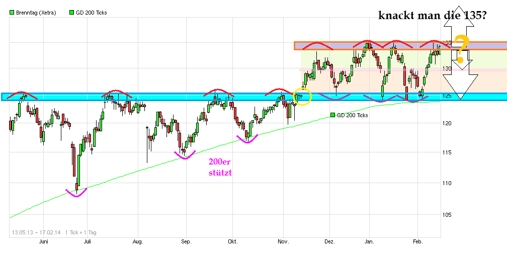 als "Festung" bewährt hat gegen größere Rücksetzer, könnte jetzt vielleicht endlich der Ausbruch nach oben gelingen, wenn man die Region 135/136 nachhaltig verteidigt. Die 200er ist inzwischen auf 127,7 € angestiegen. Somit rückt von unten stetig die "Festung" nach. Solange die Mauern der Festung nicht nachhaltig brechen sieht es weiter solide aus. Ein Belastungsfaktor der letzten Quartale war ja die zunehmende Eurostärke, da Brenntag auch im Dollarraum nicht unerheblich aktiv ist. Da Draghi ja offensichtlich den Euro wieder schwächer haben will und neben den bisherigen verbalen Interventionen auch am 5.6. mal Taten sprechen lassen dürfte, kommt von der Währungsseite etwas Rückenwind für Brenntag auf. Zudem verbessert sich ja auch die Konjunktur in den USA und in Europa stetig wieder etwas weiter. Sollte also nicht der Gesamtmarkt wieder in sich zusammenfallen, dann könnte Brenntag jetzt vielleicht aus der Seitwärtsschaukel rauskommen, um den nächsten Schritt nach oben wieder zu gehen. Bankhaus Lampe hat vorgestern das KZ von 145 auf 155 erhöht