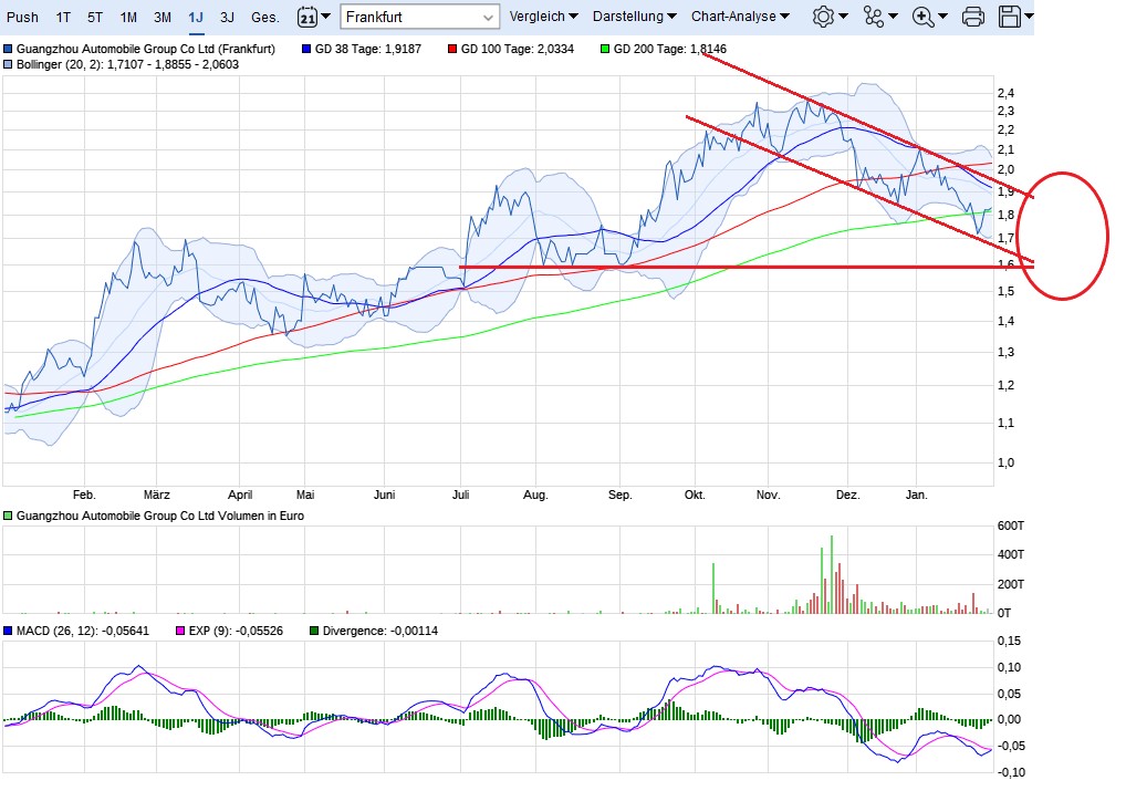 Ich glaube, dass die 1,70 Euro jetzt den Tiefstand markieren. Das Auf und Ab im Kurs ist nichts Ungewöhnliches. Mit Blick auf den 5-Jahres Chart sehe ich Rücksetzer von bis zu 50% mit anschließendem Rebound. Fundamental ist doch alles in Ordnung und das ist das Wichtigste. Die GAC Group wird voraussichtlich gut 10 Milliarden RMB net profit für 2017 einfahren, was dann ca. 70 % Plus im Vergleich zum Jahr 2016 darstellen würde. Es wurden von der Kernmarke GAC 2017 gut 36 % mehr Autos verkauft, als im Jahr 2016. Ende 2019 soll der Markteintritt in den USA erfolgen, wenn der gelingt, dann waren 1,70 Euro/Aktie im Jahr 2018 ein wahrer Schnäppchenpreis.