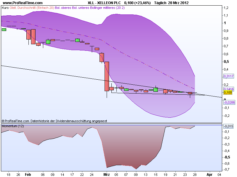 Heute ist der erste Tag, an dem der Schlusskurs den Trend durchbrochen hat (Schwarze Linien). Der Abstand zwischen den Bollinger Bändern nimmt ab, was auf einen baldigen Trendwechsel hoffen lässt (hoffentlich nach oben). Der Momentum generiert ein Kaufsignal, wenn der Schlusskurs morgen über 0,133€ liegt.