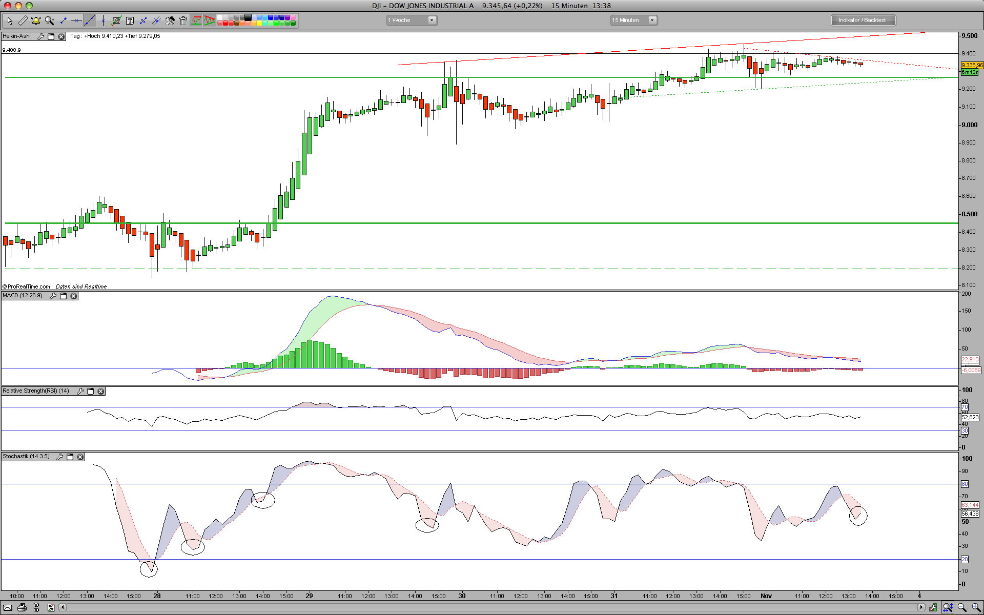 Für mich ist er aber eher überkauft. Insofern könnten Investoren,die McCain favorisieren,einen Sieg Obamas jederzeit durch einen Rutsch kommentieren. Das pro-Obama-Lager könnte dagegen einen Sprung auf diesem Niveau nicht leicht bewirken. Wenn man wie gesagt davon ausgeht, dass der DJ nicht als zu gering zu bewerten ist. Um einen Aufwärtstrend durch Obama zu signalisieren, müsste vor der Wahl von etwas niedrigerem Niveau begonnen werden.