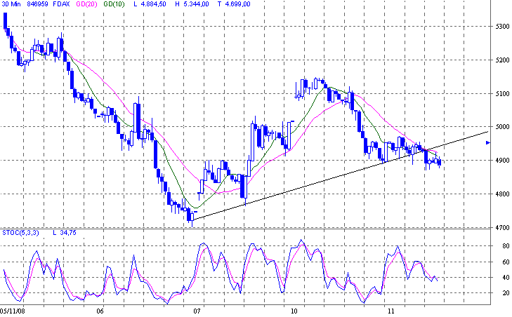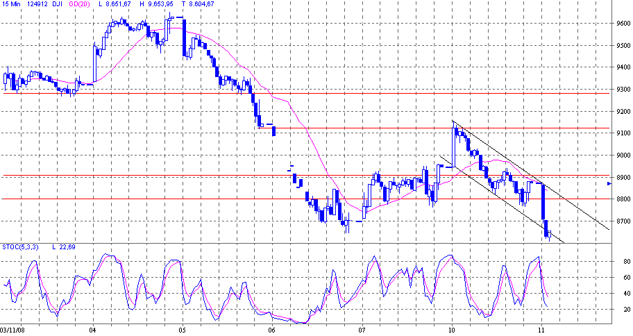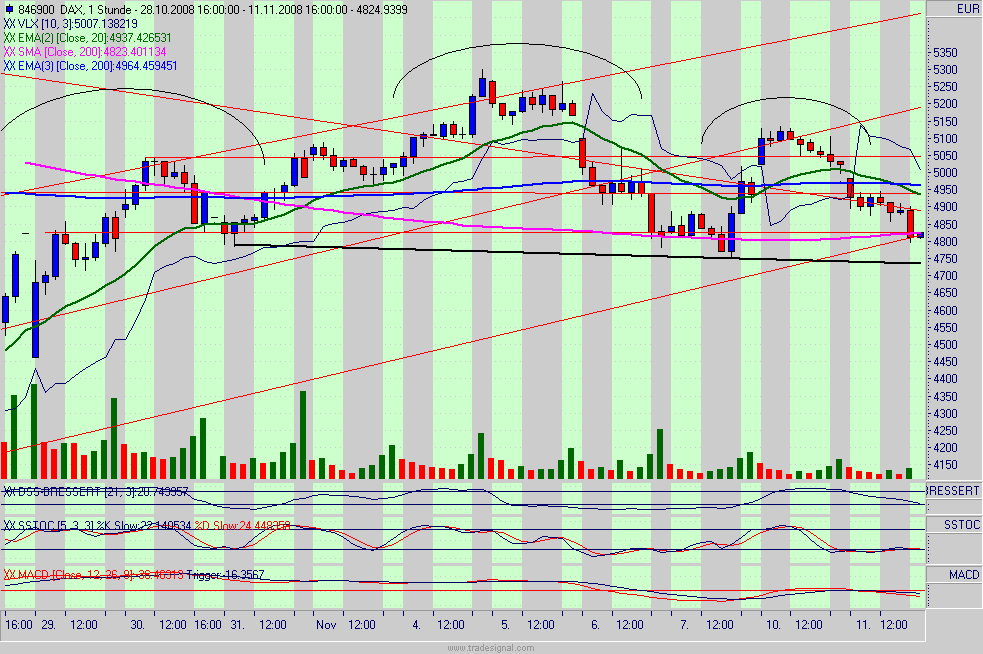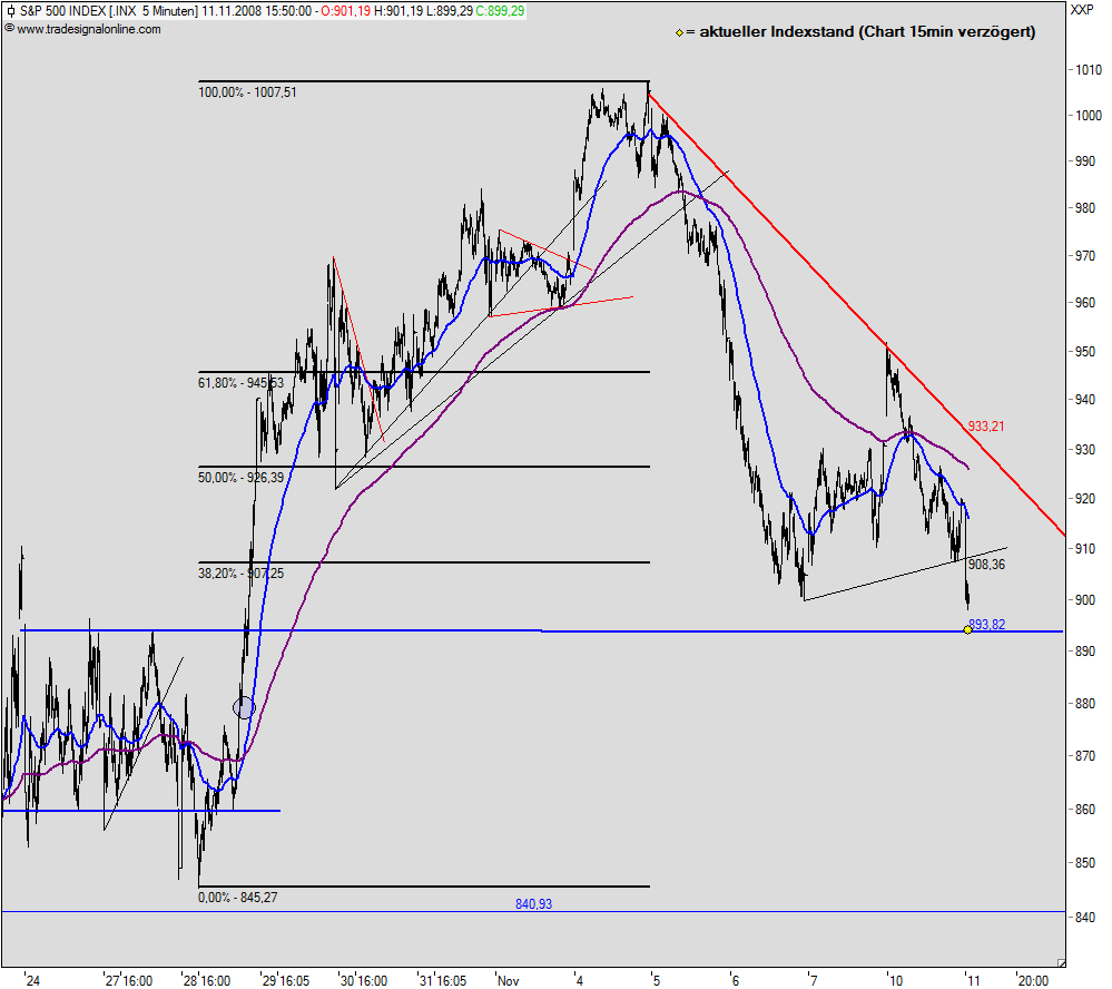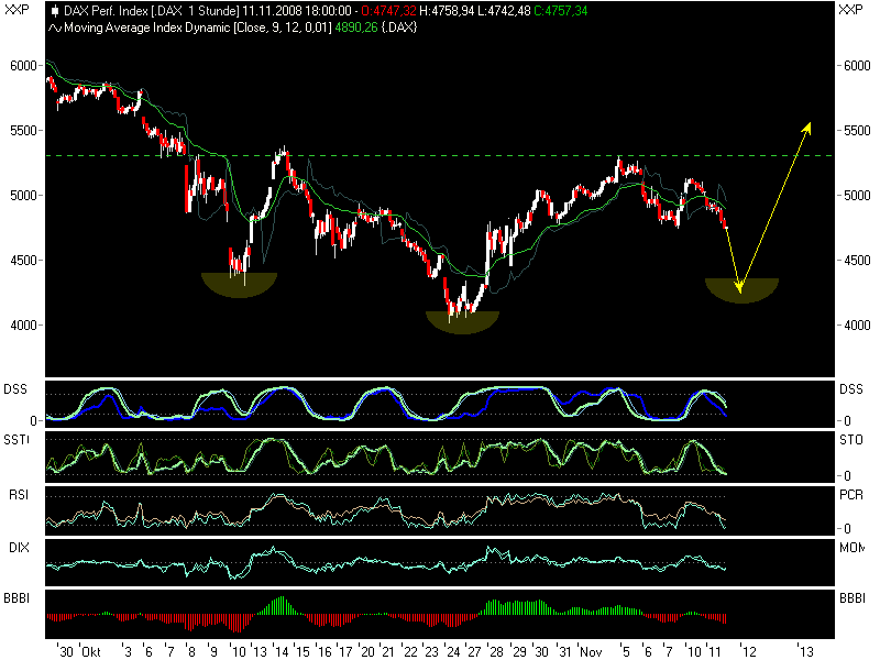 Nun hat er sich wie erwartet für die "Bodenfindung" entschieden,und zwar für Szenario X2(grau/pink) bis in den Berich 8400 bis 8200. Danach wäre wieder eine kleine Rallye fällig. Es gab ja auch ein paar good news,damit wird jetzt abverkauft und wieder eingekauft. Potential nach oben sehe ich beim DJIA z.Zt. nur noch bis 9400,die 9600 von der Wahlrallye waren m.E. klare Übertreibung (P1 grün).