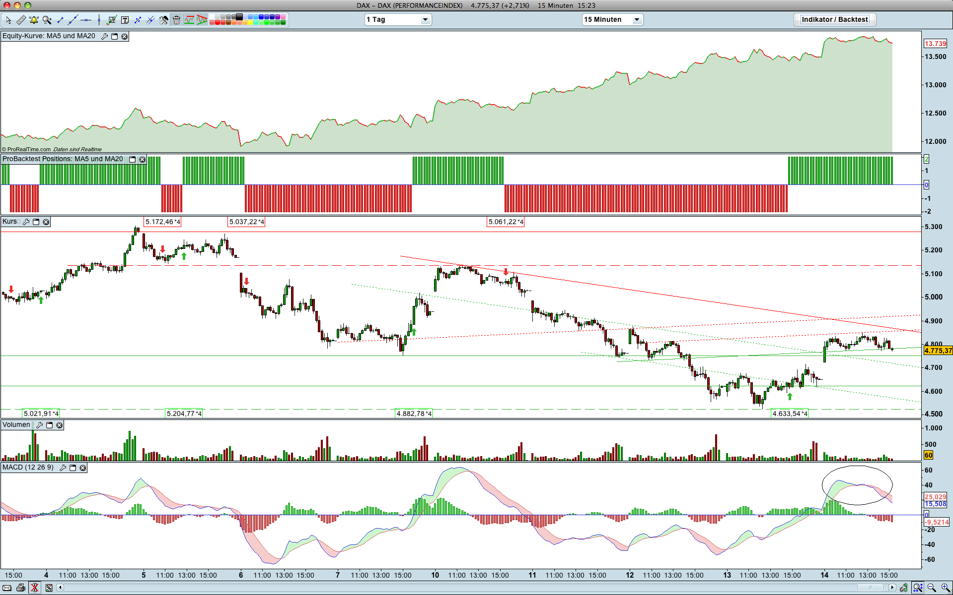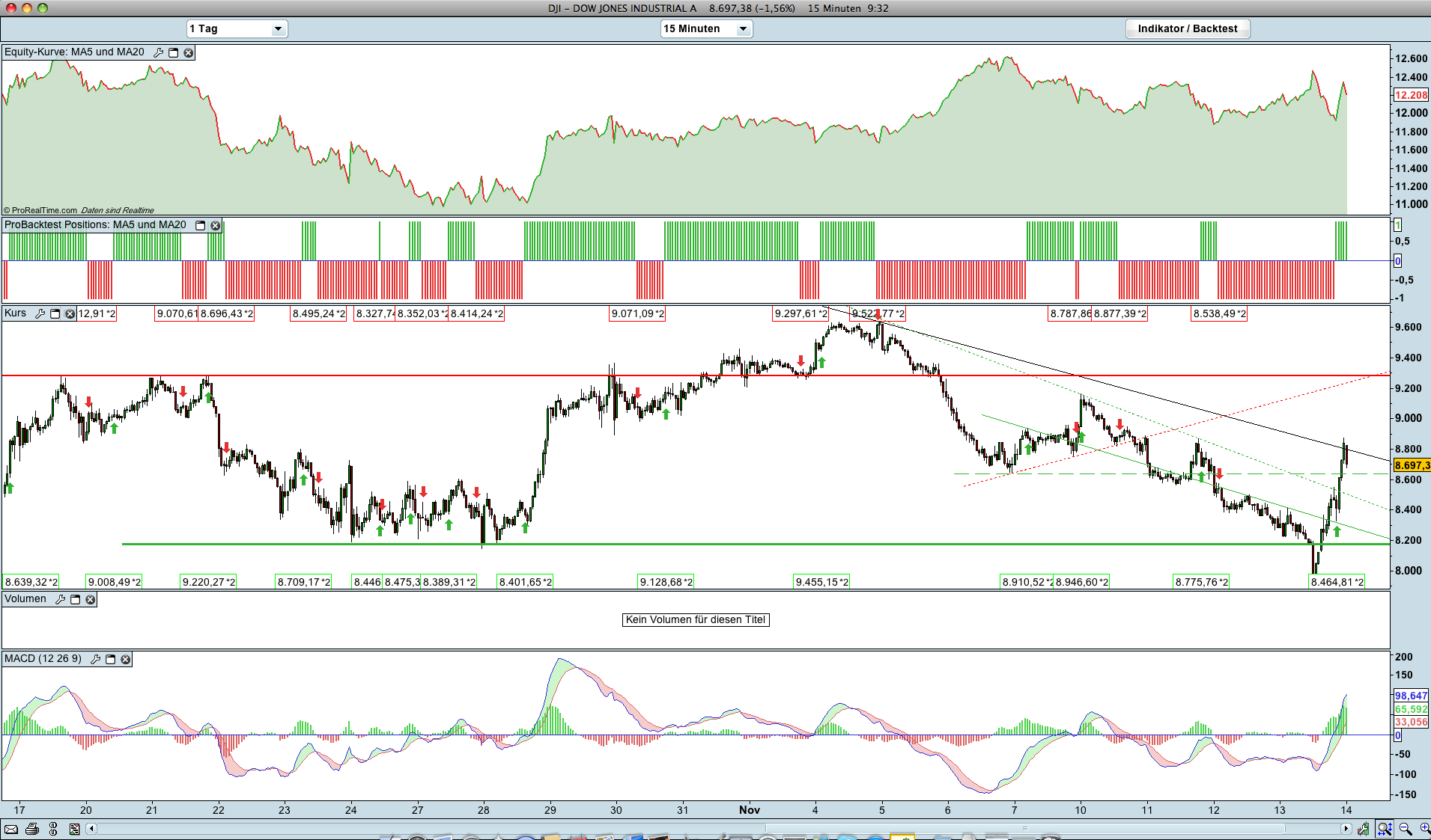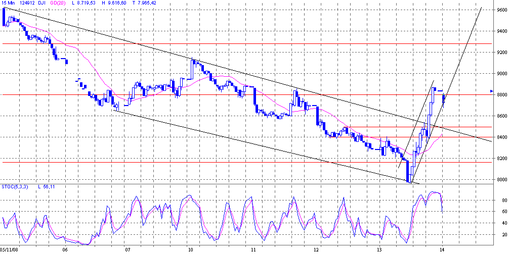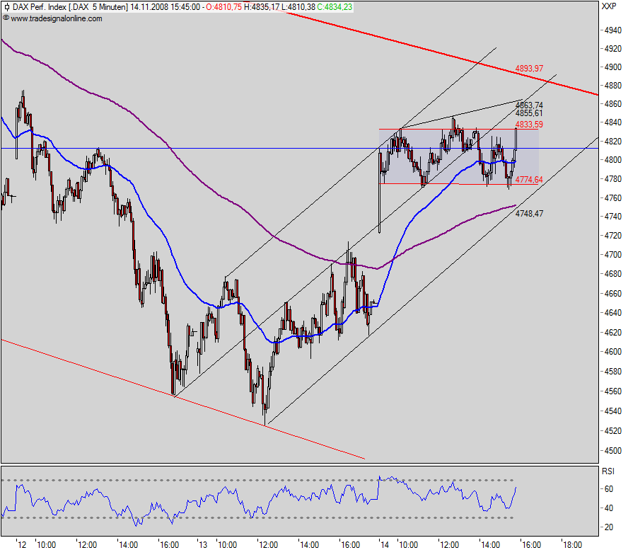 Die blaue Fläche wäre ein 7 Tage langes Halten des Oberen Trendkanals gewesen,an sich schon unnatürlich. Die pinke Fläche war die"Obama-Rallye". Ebenfalls schon ungewöhnlich. Selbst wenn man das Max. vom 10.10. als Obergrenze des Potentials annimmt,waren 9600 übertrieben,und sind durch eine gemeinsame Intervention zustande gekommen,meine persönliche Meinung.