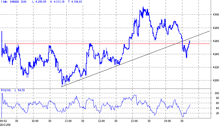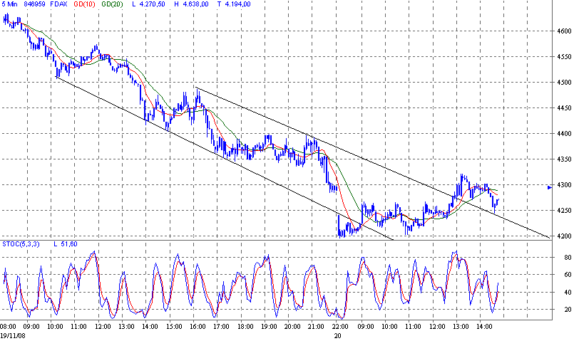 die us-eröffnung abwarten. wenn short, dann weiter schein und kleine posi zum aufstocken. ich bin seit 4203 long und habe den stop erstmal nachgezogen auf 4270. über 4310 entspannt sich die lage leicht und mit den amis zusammen, die den dow vielleicht auf 8200 hochkaufen, kann es nochmal zu einem sprung richtung 4400 reichen. richtig short gehe ich erst bei gap-close.