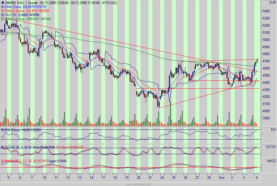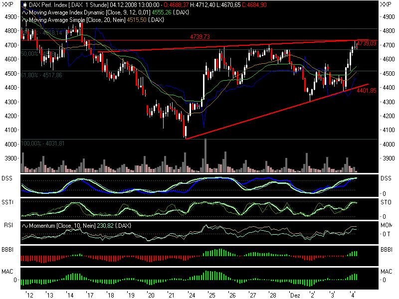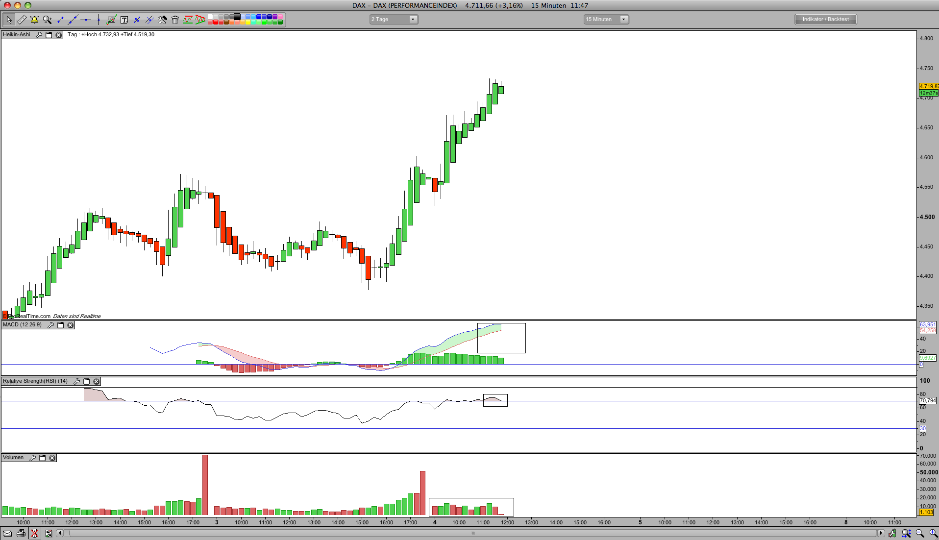 Deswegen habe ich meine Enter/Exit-Strategie auch geändert und versuche Richtungswechsel nicht mehr zu antizipieren, sondern - wie gestern - wenn der Up-/Downmove nach Richtungswechsel Fahrt aufnimmt reinzukommen. Das kostet zwar die ersten 20/30 Indexpunkte, bei den derzeitigen heftigen Bewegungen bleibt aber meist eine ausreichende Strecke übrig, um Geld zu verdienen....
