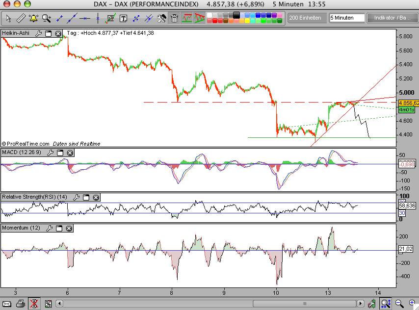 Der DAX ist aus einer Keilformation nach unten ausgebrochen. Alle bislang erhofften Unterstützungslinien wurden gerissen. Es wurde nur noch blind verkauft. Da kann man mit Charttechnik nichts mehr machen. Wirklich nicht? In der Situation selbst sicher nicht. Aber angedeutet hat es sich ja schon seit langem, wenn auch nicht in dieser Heftigkeit. Eine Unterstützungslinie aus vergangenen Jahren heran zu ziehen ist ebenfalls nicht seriös, da die damals aufgebauten Positionen längst geschlossen sind und damit kein Anlegerverhalten mehr generiert werden kann. Allerdings kann der Markt die Intensität, die er aktuell an den Tag legt nicht mehr lange durchhalten. Auch wenn ich nicht von dem herbeigesehnten finalen Ausverkauf ausgehe (alleine die Umsätze sprechen eher dagegen), rechne ich in der kommenden Woche mit einer kräftigen Gegenbewegung. Den Optimismus für den Wochenstart ziehe ich aus mehreren Überlegungen. Zum einen dürfte das G7 Treffen vom Wochenende für eine gewisse, wenn auch nur temporäre, Beruhigung sorgen. Von der technischen Seite, hat der DAX ein kräftiges Intraday-Reversal hinterlassen. Auch wenn dieses nicht als reinrassiger Hammer zu werten ist, sollte es einen ähnlichen Effekt geben, also eine Gegenbewegung. Wie weit kann der DAX nun steigen? Dafür habe ich einmal die Fibonacci-Technik herangezogen. Danach liegt das 38,2% Retracement (auf die vorherige Abwärtsbewegung) bei knapp über 5.000 Punkten. Das halte ich als Reaktionsziel durchaus für möglich. Wenn es ganz gut kommt, ist auch das 50% Retracement bei gut 5.200 Punkten denkbar. Beide Linien habe ich ihnen im Chart verstärkt dargestellt. Und wie geht es dann weiter? Ich glaube nach wie vor, dass noch nichts ausgestanden ist und der finale Sell-off noch vor uns liegt. Deshalb werde ich die Anstiegsbewegung (wenn sie denn hoffentlich kommt) nutzen um noch einmal eine short-Spekulation zu öffnen. Dies in der Hoffnung, dass es dann endlich den finalen Ausverkauf gibt. Ach ja, und ich werde außerdem den wieder etwas günstigeren Gold-Preis nutzen, um meine Goldbestände noch einmal aufzustocken.