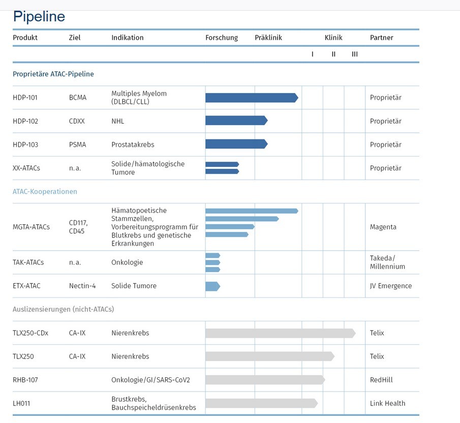 HDP aktuell ist so ein bißchen wie Morphosys im Frühstadium. Man hat zwar noch nicht die ganz großen Partner, wie MOR damals mit Novartis, und man hat auch noch nicht 5 Projekte in der eigenen P1/2, aber man könnte realistisch 2022 soweit sein wie Morphosys im Jahr 2010. In der Partnerpipe könnte man sogar weiter sein, was deren Spitze betrifft, denn MOR hatte damals zwar eine sehr breite Partnerpipe aber noch nix kurz vor möglicher Zulassung wie HDP beispielsweise bei Redhill. Und vor allem ist der Börsenwert nicht bereits sehr hoch, wie bei diesen schon angesprochenen Aktien, die auf ein einziges weit fortgeschrittenes Projekt setzten und dann bei scheitern vor dem Nichts stehen. HDP aktuell bei 148 Mio Börsenwert. Setze ich mal noch zwei Kapitalerhöhungen je 10% an, liegen wir bei 179 Mio €. Ich gehe davon aus, dass man Ende 2022 realistisch 500 Mio Börsenwert erreicht und 2-3 Jahre später die 1 Mrd €. Man sollte 2024/25 möglichst 2-3 Projekte in der P2 der Eigenpipe haben, 10-15 in der Partnerpipe, davon 3-4 n P2/3 und vielleicht gibt es dann schon eineMedikament am Markt. Letzteres könnte schon 2022/23 der Fall sein, falls es bei Redhill rund läuft. Unter Umständen gibt es sogar schon zwei Zulassungen bis 2024. Dann sehen wir sicherlich die 1 Mrd € ziemlich sicher als Börsenwert. Aber wie gesagt, mir ist eher die Breite wichtig.