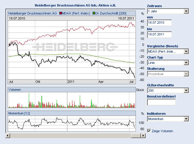 interessante These, bin aber selbst davon überzeugt, dass Heidelberg nach wie vor ein strukturelles Problem hat. Der Markt in USA ist so gut wie tot. Die Chinesen brauchen nicht die Maschinen welche Heidelberg im Wahn, immer schnellere und auch immer teuerer, mit weniger Personal bedienbare Maschinen zu bauen, entwickelt hat. Es gibt keinen Markt mehr dafür. Heidelberg produziert schon viel zu lange daran vorbei. Die hochgeprisesen Baureihe XL-mit Wendung, laut Werbung von Heidelberg damals eine Druckmaschine welcher jeder mittelständischen Druckerei einen Quantensprung versprach, ist am Markt nicht gefragt. Der SM-Reihe welche die Pferde seit 1976 am sauffen hielt, fängt an zu lahmen. Die GGF Reihe im Verpackungsdruck, wird zwar von Druckerfraeks hochgelobt. Bis da mal die Pferde zum sauffen kommen, kann es schon zu spät sein. Heidelberg war zu geblendet von den vergangenen Erfolgen. Man hat den Markt falsch eingeschätzt. Beispielhaft die fatale Produktion auf Halde vor der letzten Drupa. Das Aktienrückkaufprogramm bei vollkommen überogenen Kursen (32€).Schuld waren aber immer andere. Finanzkrise, Bankenkrise, jetzt aktuell der Reaktorunfall in Japan und oder wieder die Chinesen welche Kredite zurückhalten. Glaubhaft ist diese Regierung bei Heidelberg nicht mehr. Die Aktionäre sollten sie abwählen. Geht aber nicht, wegen dem beschissenen Wahlrecht.