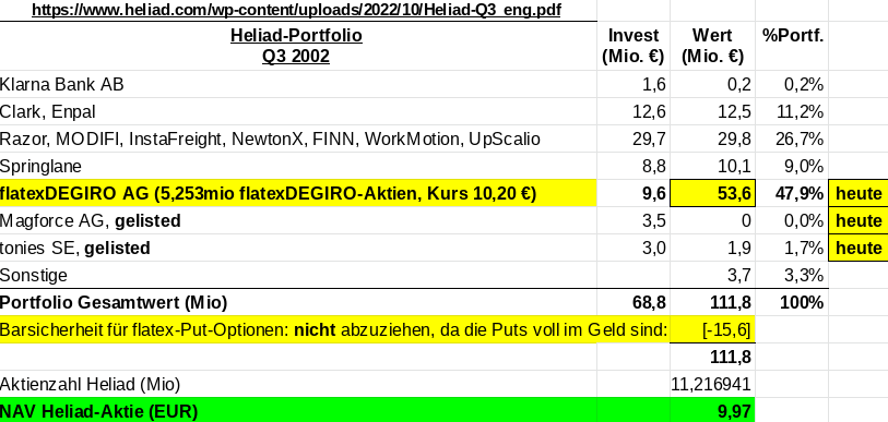 HELIAD habe im juli 2021 rund 7,5mio in die Enpal, einem leasinggeber für solaranlagen investiert, "damals zu einer Unternehmensbewertung von 700 Mio. Euro (pre money), bzw. 900 Mio. Euro (post money)"; Enpal weise eine beeindruckende wachstumsstory auf: "Nachdem sich 2020 die Umsätze auf 56 Mio. Euro verdreifachten und 2021 bereits 110 Mio. Euro erlöst wurden, sind für das laufende Jahr 400 Mio. Euro und im kommenden Jahr rund 800 Mio. Euro geplant. Dabei soll heuer erstmals auch ein positives EBITDA erzielt werden. Heliad-Geschäftsführer Julian Kappus wies darauf hin, dass Enpal in finalen Gesprächen sei, noch im laufenden Jahr eine weitere Finanzierungsrunde abzuschließen, die bei einer Unternehmensbewertung von rund 2 Mrd. Euro über die Bühne gehen soll. Darüber berichtete auch das Handelsblatt. Demgemäß sollen in der neuen Finanzierungsrunde weitere 150 Mio. Euro an Kapital für die Finanzierung des weiteren Wachstums sowohl von Bestandsinvestoren als auch von neuen Adressen eingesammelt werden. Bestätigt sich die Einschätzung, dass die Finanzierungsrunde noch im laufenden Jahr und zu einer Bewertung von rund 2 Mrd. Euro über die Bühne geht, so winkt Heliad zum Jahresende allein aus dieser Transaktion eine spürbare Aufwertung, die den Heliad-NAV je Aktie um rund 0,70 Euro nach oben bringen würde."