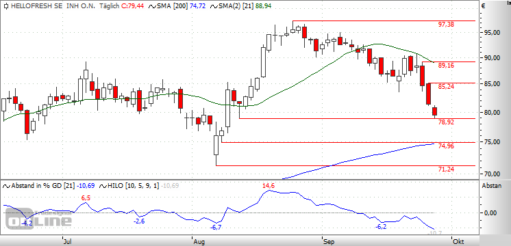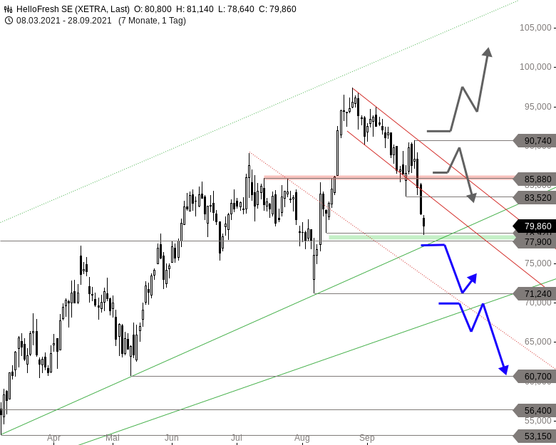 Aktuell nähert man sich nicht nur der Unterseite des Trendkanals, sondern auch den Supports bei 78,92 und 77,90 EUR - und dies mit enormer Geschwindigkeit, seit ein ohnehin steiler Abwärtstrendkanal auch noch nach unten verlassen wurde.Kann die Aktie jetzt also nicht direkt den Weg Richtung 83,52 EUR und darüber auf 85,88 EUR einschlagen, sollte es zum Bruch der Kreuzunterstützungszone um 77,90 EUR und damit einem Abverkauf bis 71,24 EUR kommen. Dieser Startpunkt der letzten Rallyphase könnte Käufer anlocken und eine leichte Erholung nach sich ziehen. Mittelfristig muss man aber damit rechnen, dass die große Korrektur zunächst weiter bis 67,00 EUR und später bis an den Support bei 60,70 EUR reicht.