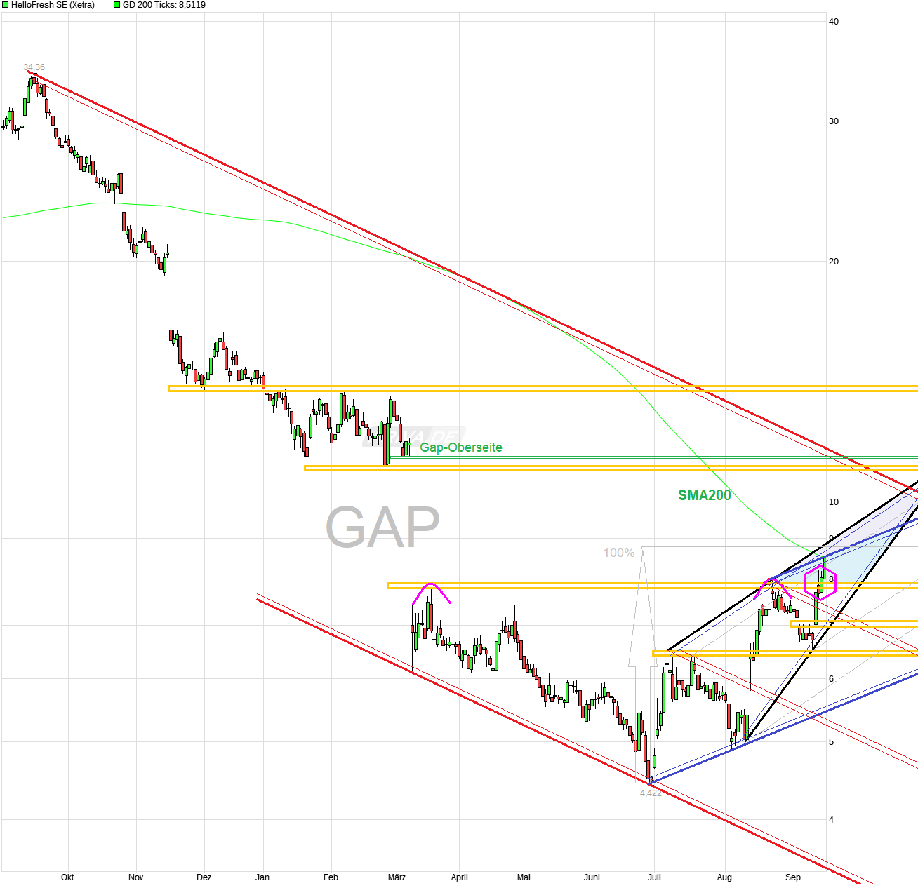 HelloFresh Aktie: Starke Kaufsignale - kommt der große Short-Squeeze? 16.09.2024 www.4investors.de/nachrichten/...?sektion=stock&ID=179069 ".....Die HelloFresh Aktie hat ihren Ausbruch über die wichtigen charttechnischen Hindernisse zwischen 7,40/7,44 Euro und 7,798 Euro am Freitag bestätigen können..... Kommt es zum Ausbruch über 7,80/7,95 Euro, „könnte der Druck einzudecken auf die Shortseller wachsen, die bei HelloFresh enorm aktiv sind. Ein möglicher Pullback fände spätestens an der 200-Tage-Linie eine erste weitere Trendmarke“, hieß es schon im August in den 4investors-Chartchecks zur HelloFresh Aktie... Mittlerweile hat sich dieses Szenario realisiert.... Für die Etablierung eines Aufwärtstrends bei der HelloFresh Aktie gilt es in nächster Zeit vor allem zwei Hürden zu überwinden: Zum einen die noch fallende 200-Tage-Linie, zum anderen das direkt darüber liegende Abwärtsgap aus dem März 2024 .... Gelingt dies, könnte es in Richtung 11-Euro-Marke nach oben gehen. Dass derDruck auf Shortseller, ihre Positionen einzudecken, mit steigenden Kursen wächst, kommt hier hinzu...."