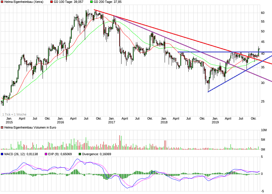 Solange man oberhalb 38,7 € bleibt, wo ehemaligen Abwärtstrend als auch 200TageLinie verlaufen, ist die Chartlage klar bullish, zumal unter fundamentalen Gesichtspunkten auch vieles für Helma spricht. KGV etwa 8,0-8,5 fürs kommende Jahr.