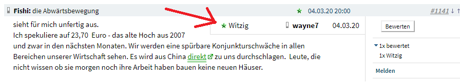 mach ich mir keine Sorgen. Natürlich wird es in den nächsten Monaten irgendwann einen spürbaren Einbruch geben, weil der Konsum extrem einbricht. Aufgeholt wird da nichts, das fehlt eben, da die Menschen sonst ja permanent konsumieren. Nach der Flaute geht es dann normal weiter, dass Anziehen des Konsums beschränkt sich lediglich auf das Verhältnis zum vorherigen Konsumverzicht. Aber das ist ja auch kein Grund, auf den Hausbau zu verzichten. Selbst im Supermarkt wird man das merken, weil die Leute nach der Virus Epidemie erstmal ihre angelegten Vorräte verzehren.