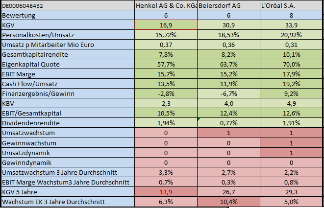 Henkel hat hier eindeutig die Nase vorne und ist etwa halb so teuer wie Beiersdorf oder LOreal. Ich hoffe wir finden Antworten für diese Bewertung.