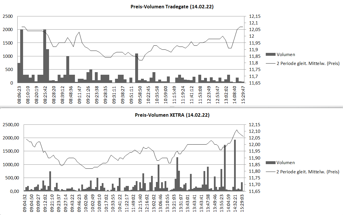 Heute ist mir beim Kursverlauf aufgefallen, dass wir auf Tradegate am Morgen, als der Kurs gefallen ist, die hohen Volumen gesehen haben und bei XETRA am frühen Nachmittag, als der Kurs stieg (Auswertung endet um 15:30 Uhr).